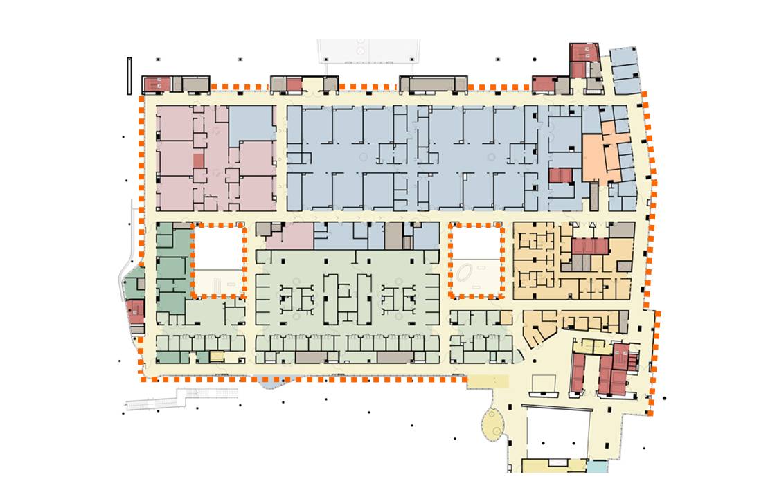 위의 평면은 미국 콜로라도의 ‘팔로마 메디컬센터 에스콘디도’의 수술부층입니다. 주황색 점선으로 표현된 채광창을 보시면 내부 복도의 공간 분위기를 짐작하실 수 있을 것입니다. 특히 햇볕이 닿지 않는 안쪽 공간에도 중정과 테라스를 설치하여 거의 모든 내부 복도들이 자연채광이 닿도록 하고 있습니다.