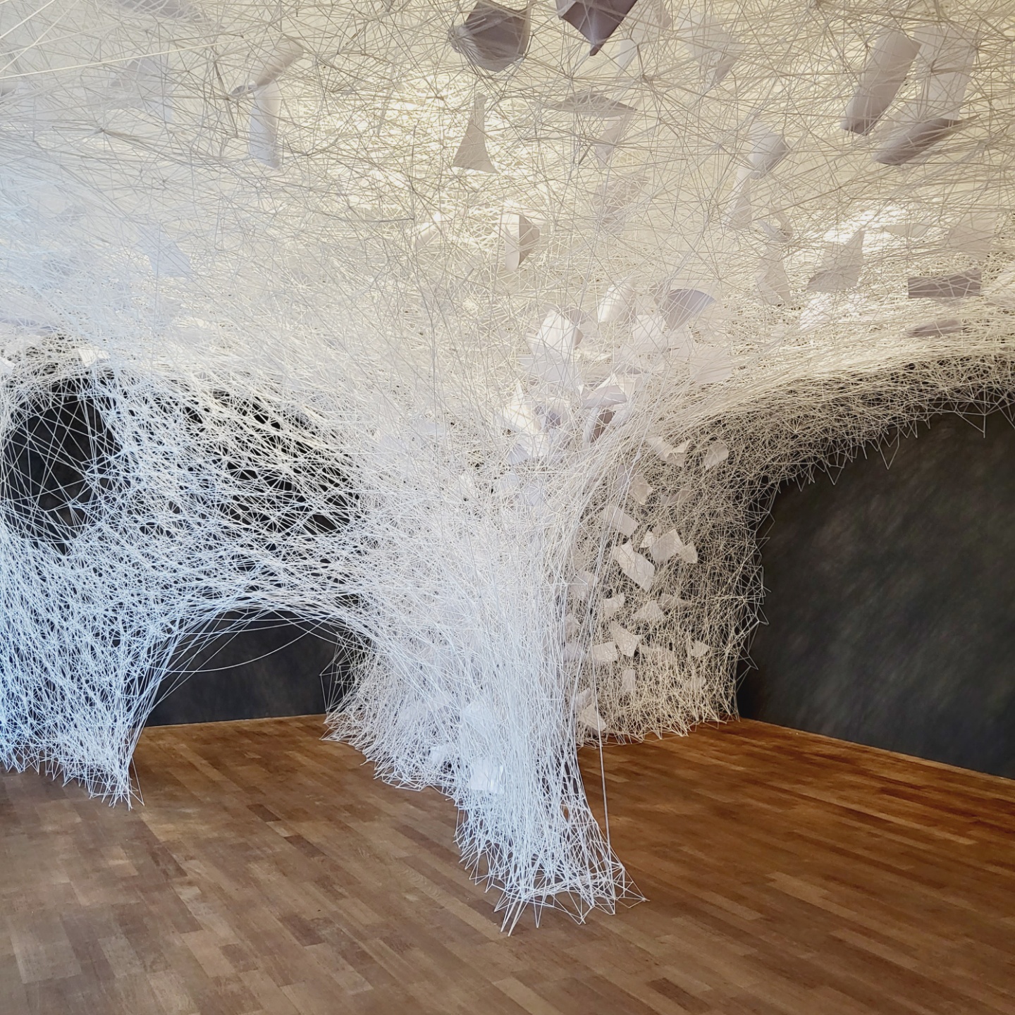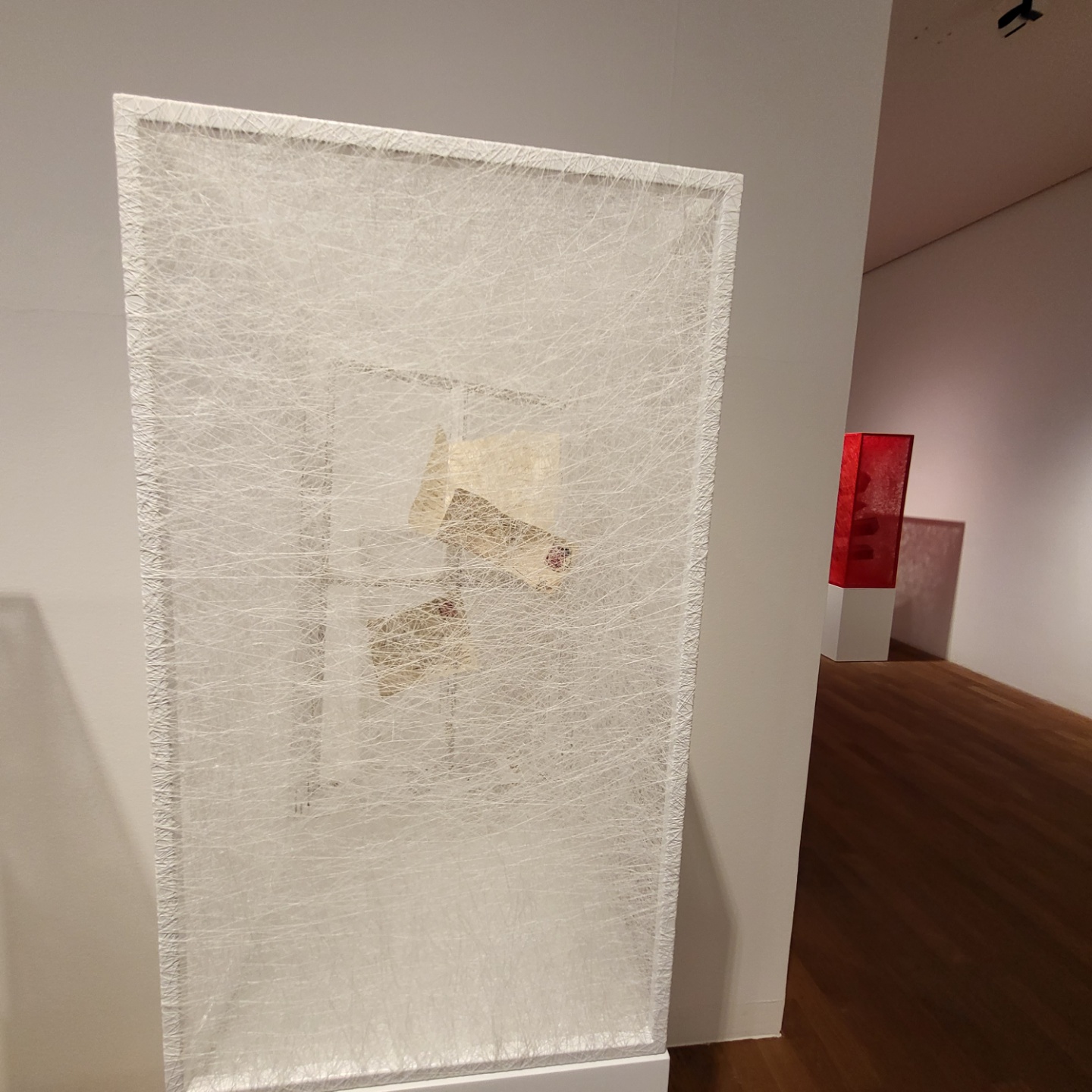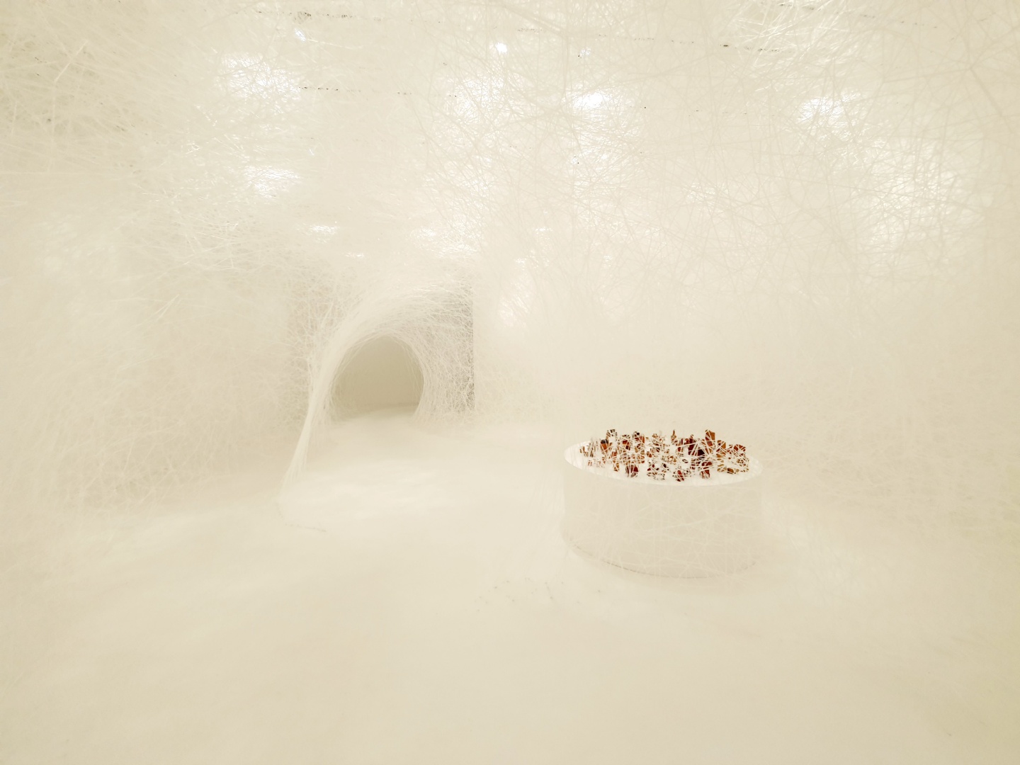 이번 전시에서는 흰색 실로 가득한 공간을 만날 수 있었다. 물론 2년 전 공식 전시에서는 빨간색 실로 엮어진 공간을 만났다면, 이번 전시는 흰색 실이다. 파라다이스시티호텔에서 만났던 작품도 흰색이었지만, 이번 전시에서의 흰색에 작가는 스스로 의미를 부여했다.