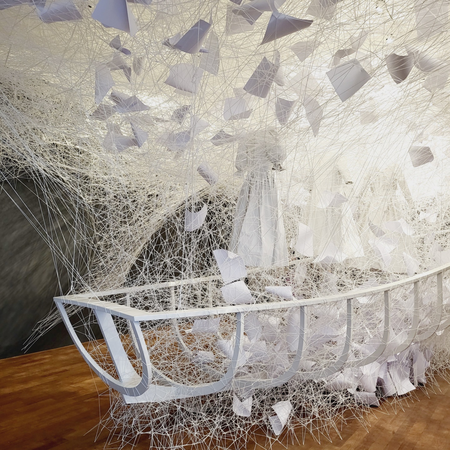 in memory, 2022 흰색의 실로 만들어진 설치미술 중간에는 배가 떠있고, 그 위에 흰 원피스 세 개도 떠있다. 드레스는 제2의 피부, 사람을 의미한다고 했는데, 이 배는 그들의 기억을 담아 항해하는 미지의 여행을 표현하는 것도 같고, 모호한 끝을 알 수 불투명한 미래를 향해 나아가는 우리의 알 수 없는 삶을 표현한 거 같기도 하다. 천장의 실타래 속에 켜켜이 채워져 있는 흰색의 종이들은 누군가에게는 희망을 누군가에는 힘듦을 표현한 일기이자 메모일 수도 있다. 아마 한 사람 한 사람의 의미 있는 기억(memory) 일 것이다.