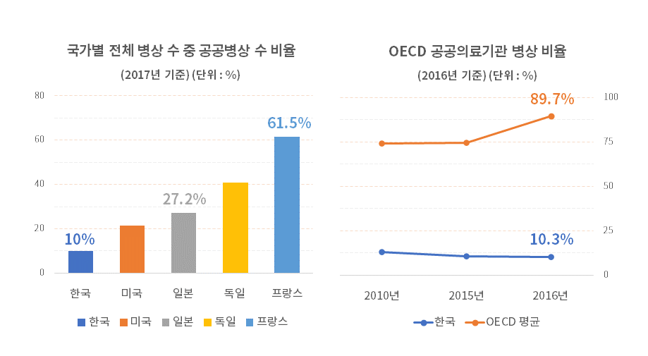 출처 : 전국지방의료원연합회 현재 우리나라에서 공공의료기관은 2019년 기준으로 221개 기관으로 전체 의료기관의 5.5% 비중을 가지고 있다. 이는 OECD 평균인 65.5%에 한참을 못 미치는 수치로 해당 국가 중 최하위다. 병상 수로 보면 공공병상 수는 61,779병상으로 전체의 9.6%에 불과하며 이는 OECD 평균인 89.7%과는 차이를 보인다. 사회보험 방식(SHI)을 통해서 재원을 조달하는 나라를 비교하더라도 우리나라의 수치는 아래를 밑돈다. 프랑스의 경우 공공 병 상비율이 61.5%, 독일은 40.7% 일본의 경우 27.2%이다. 17개 시, 도별로도 공공의료 병상의 격차가 존재한다. 울산광역시 및 세종특별자치시의 경우는 공공병상을 가지고 있지 않다. 전국 평균 비율은 9.6%이며, 제주가 32.1%로 가장 높고, 강원이 그다음으로 높다.