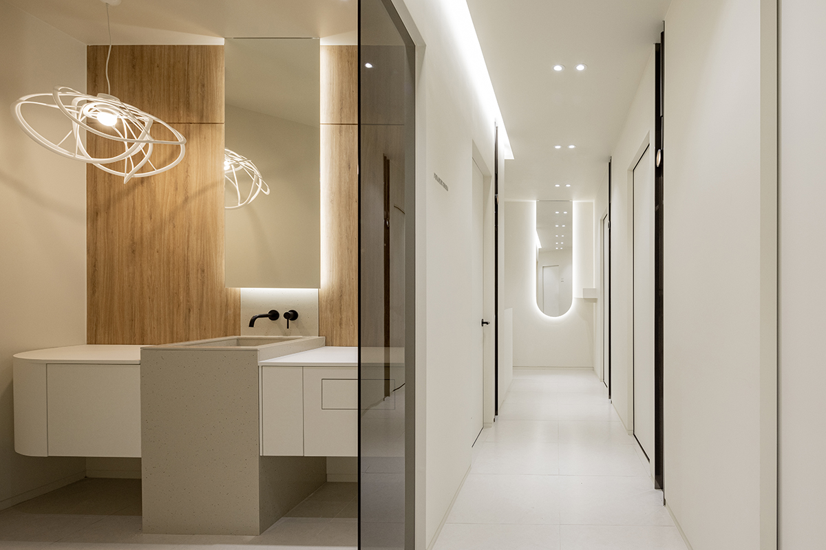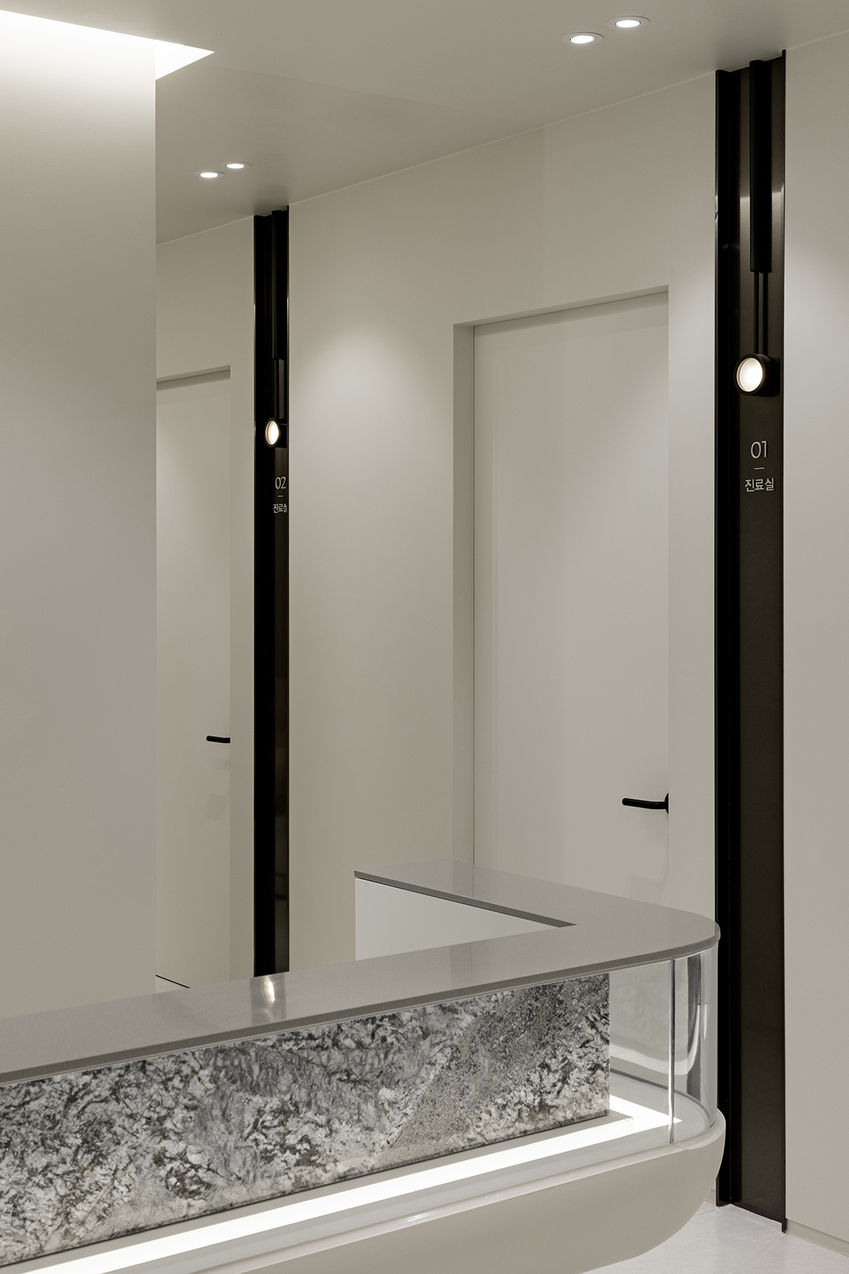 ⓒHW studio 높은 층고와 긴 복도를 따라 각 진료실을 알려주는 룸 사인과 제작조명으로 디자인 요소를 담아냈으며, 제작조명은 각 재실을 알려주는 센서 역할도 한다.