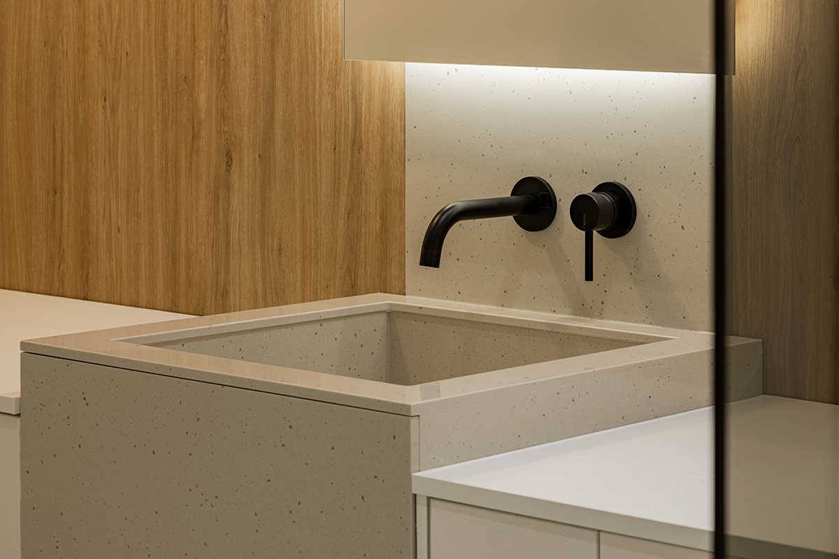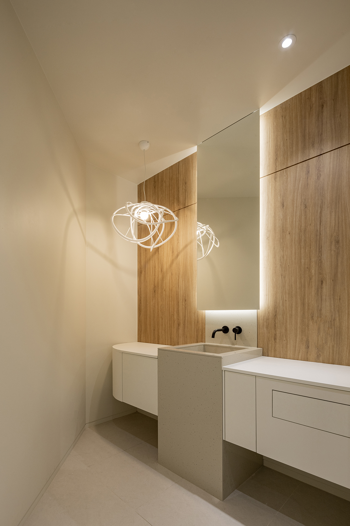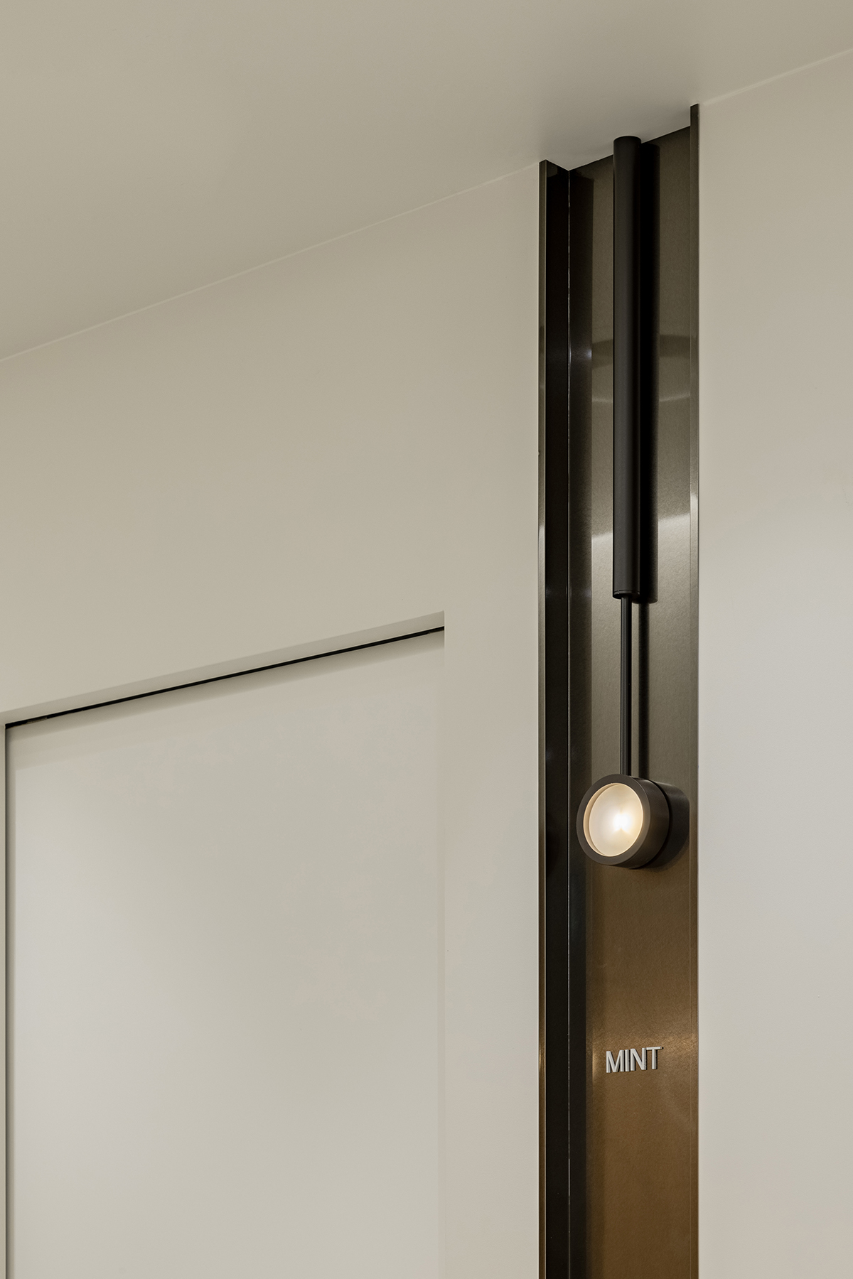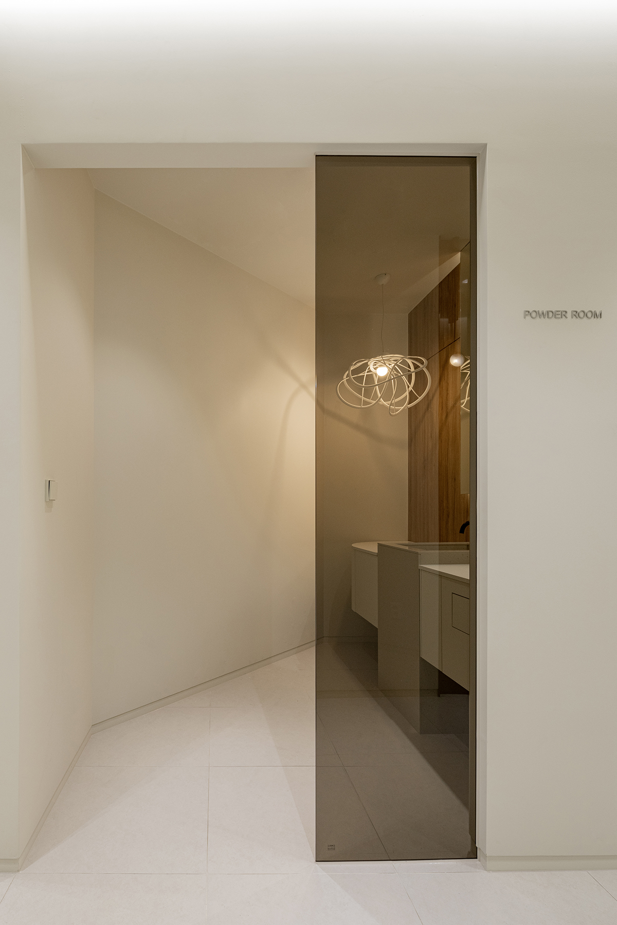 파우더룸은 복도에서 노출을 최소화하되, 답답하지 않게 브론즈 유리로 파티션 역할을 했으며 고급스러운 무광 블랙 벽매립 수전과 대리석으로 고급스러움을 담아냈다.
