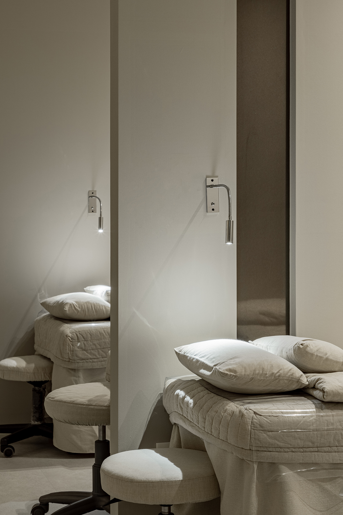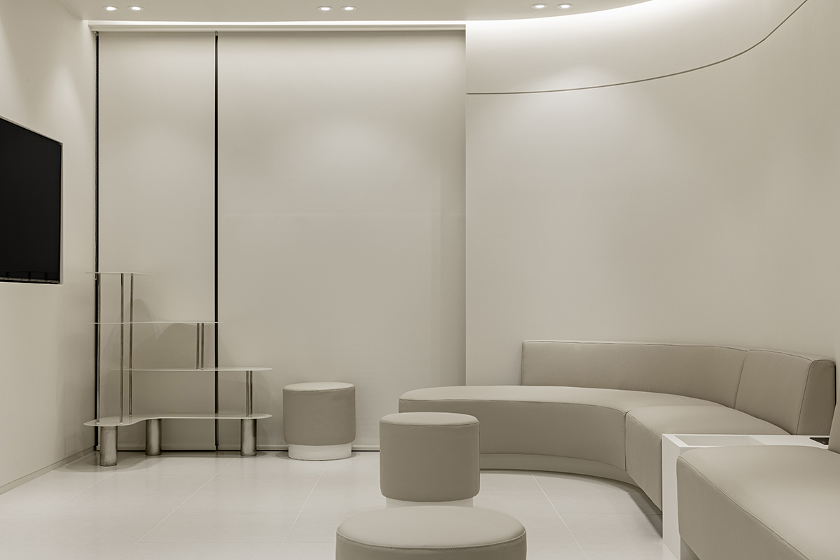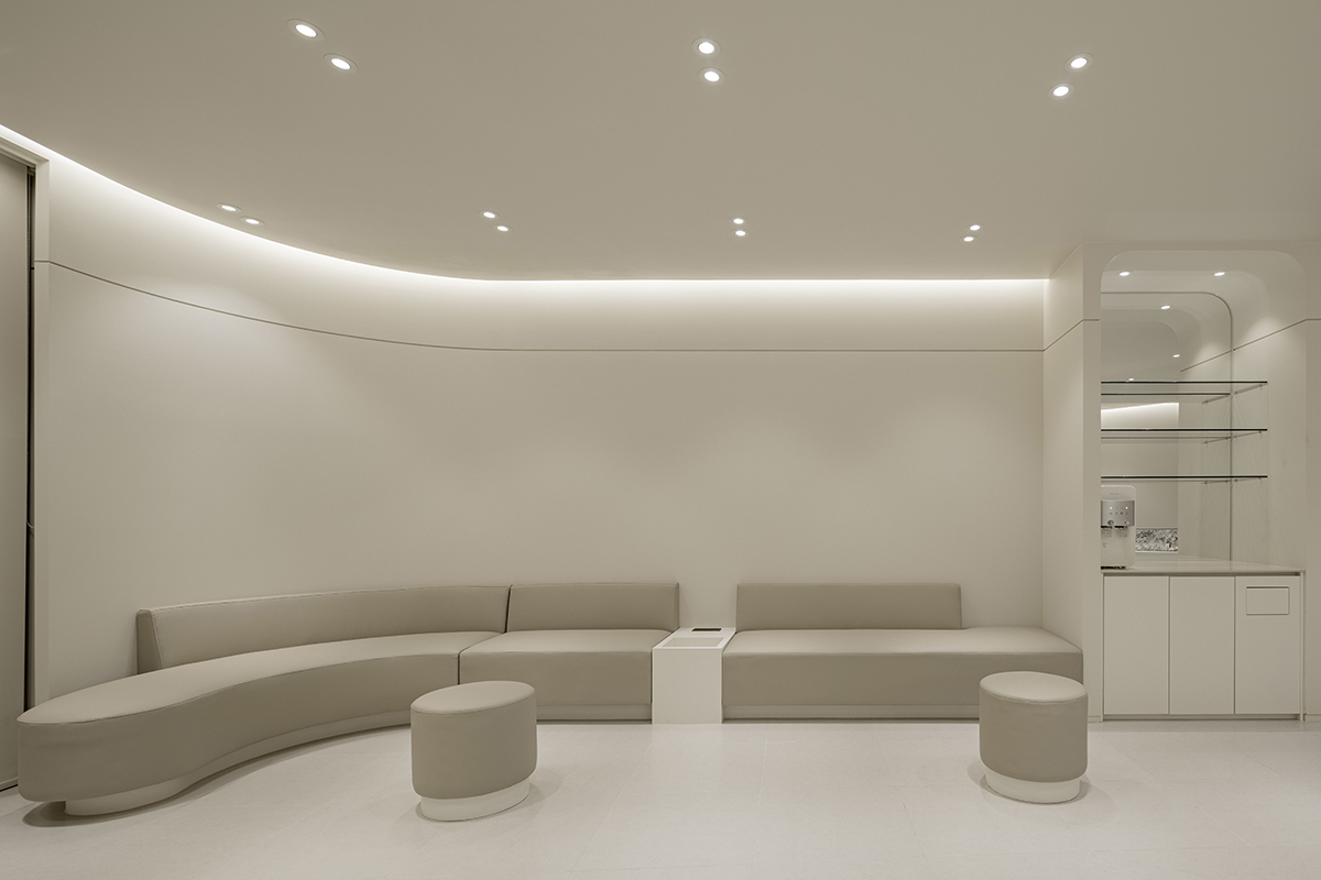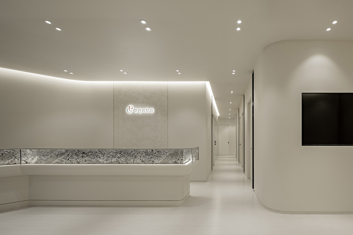 좁은 입구에서 대기공간을 확장감 있게 보여주기 위해 인포데스크를 사선으로 배치하여 공간을 보다 더 깊이감 있게 구성하고, 부드러운 곡선과 은은한 라인조명, 차분한 아이보리 톤을 사용해 더 아늑한 공간으로 연출하였다.