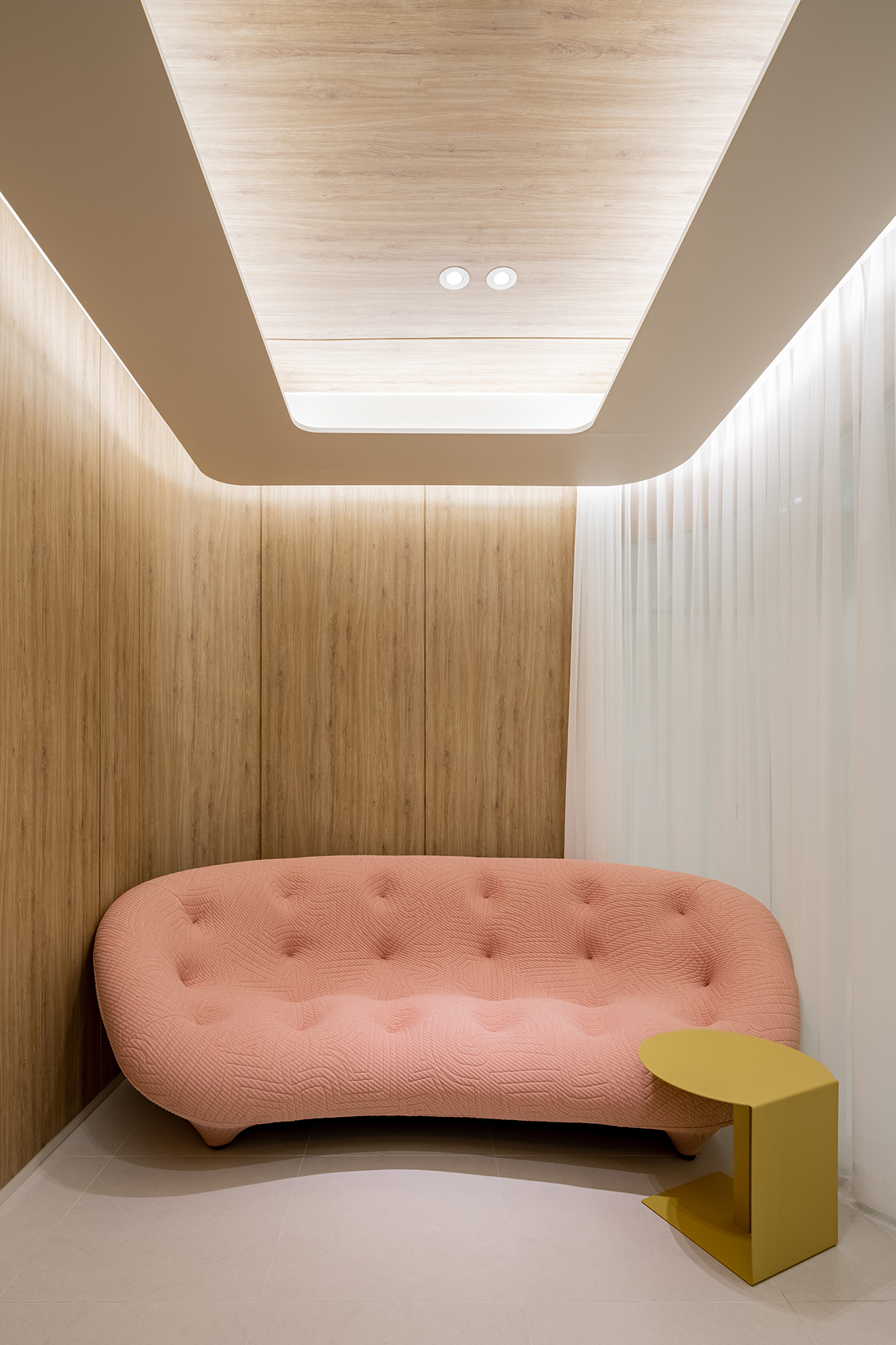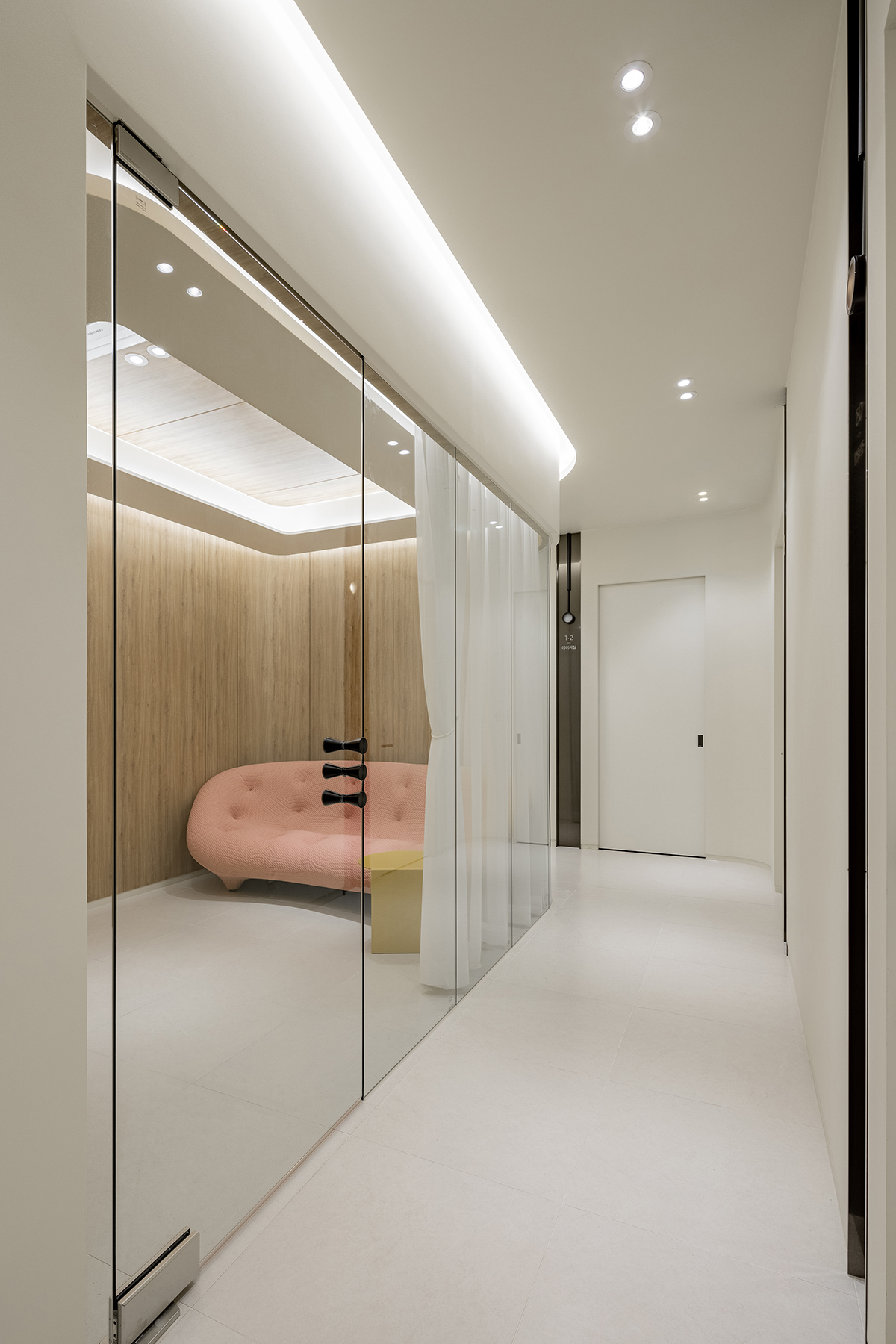 환자뿐만 아니라 일반 사람들과 지식을 나누기 위해 유튜브를 시작한 원장님을 위해 VIP 대기실은 필요시 유튜브 촬영공간으로도 활용 가능하도록 프라이빗하면서 고급스러운 분위기를 연출하였다. 이를 위해 전체 유리월에 시스루 커튼을 설치하고 디자인적으로 담아낸 손잡이와 나뭇결이 느껴지는 고급스러운 우드 마감재, 천장 이중 간접조명으로 안온한 무드의 공간을 구현하였다.