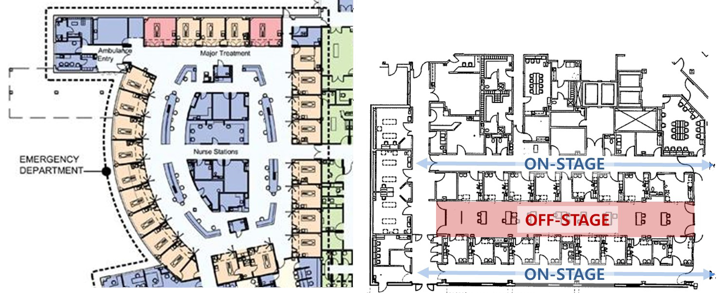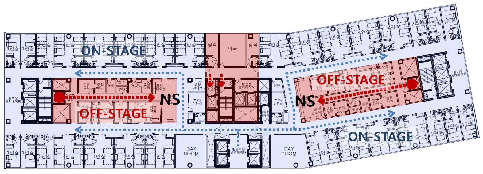 On-Stage (Public) / Off-Stage (Private) 일반적으로 대형 병원에서는 내부의 혼잡을 해소하기 위해 동선을 나누게 됩니다. 우리나라에서는 공용복도와 직원복도 등 ‘동선’ 개념으로 분류하는 편인데 반해, 미국에서는 ‘영역’ 개념으로 나누어 ‘on-Stage, off-stage’란 용어를 더 많이 사용합니다.