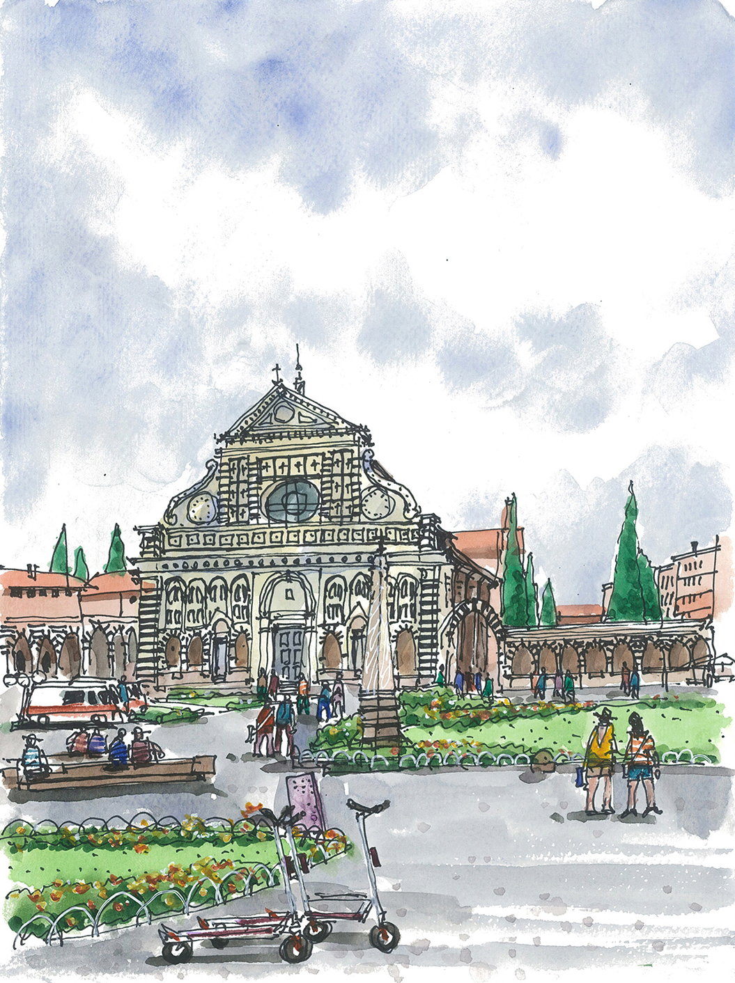 피렌체 골목길 알베르티의 역작 산타마리아 노벨라 성당의 규모는 상대적으로 아담하지만 외관은 완벽한 황금비의 비례로 설계되었다. 성당의 경건한 예배공간도 좋지만 부속 공간을 박물관으로 활용하는데 칼릴 지브란을 연상하게 하는 몽환적인 벽화와 프레스코 천정화, 수도원에는 정원과 중정을 낀 열주 회랑이 인상적이다.