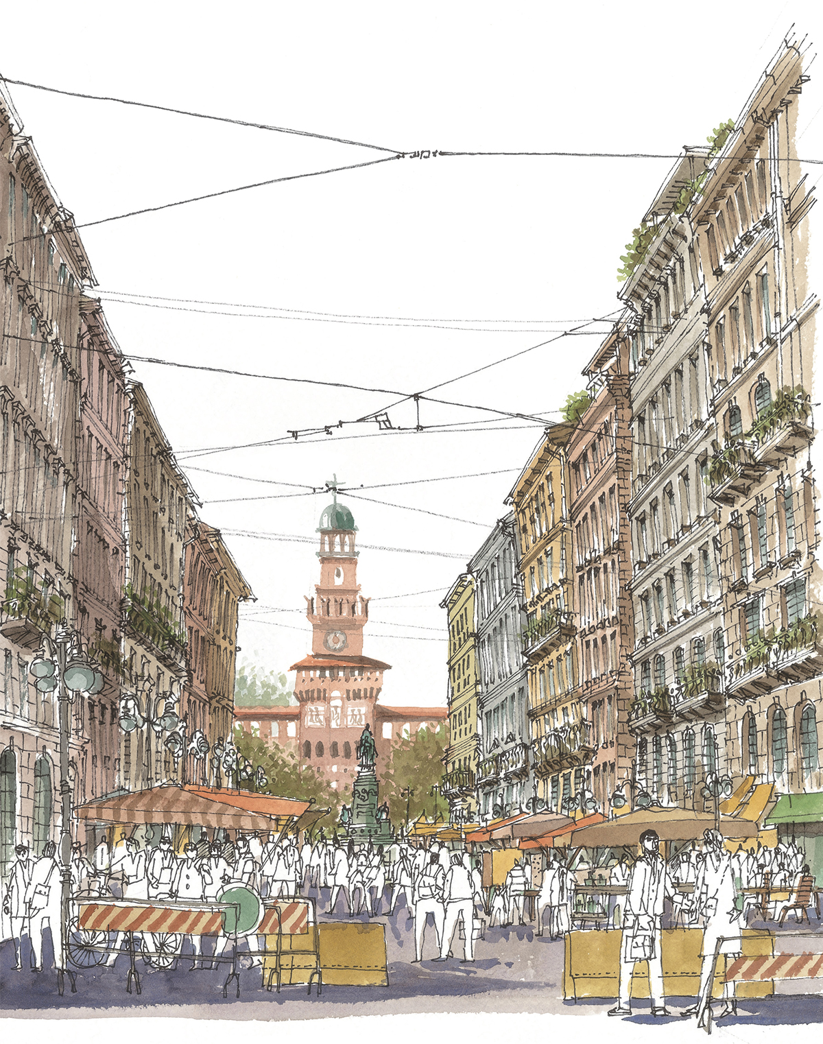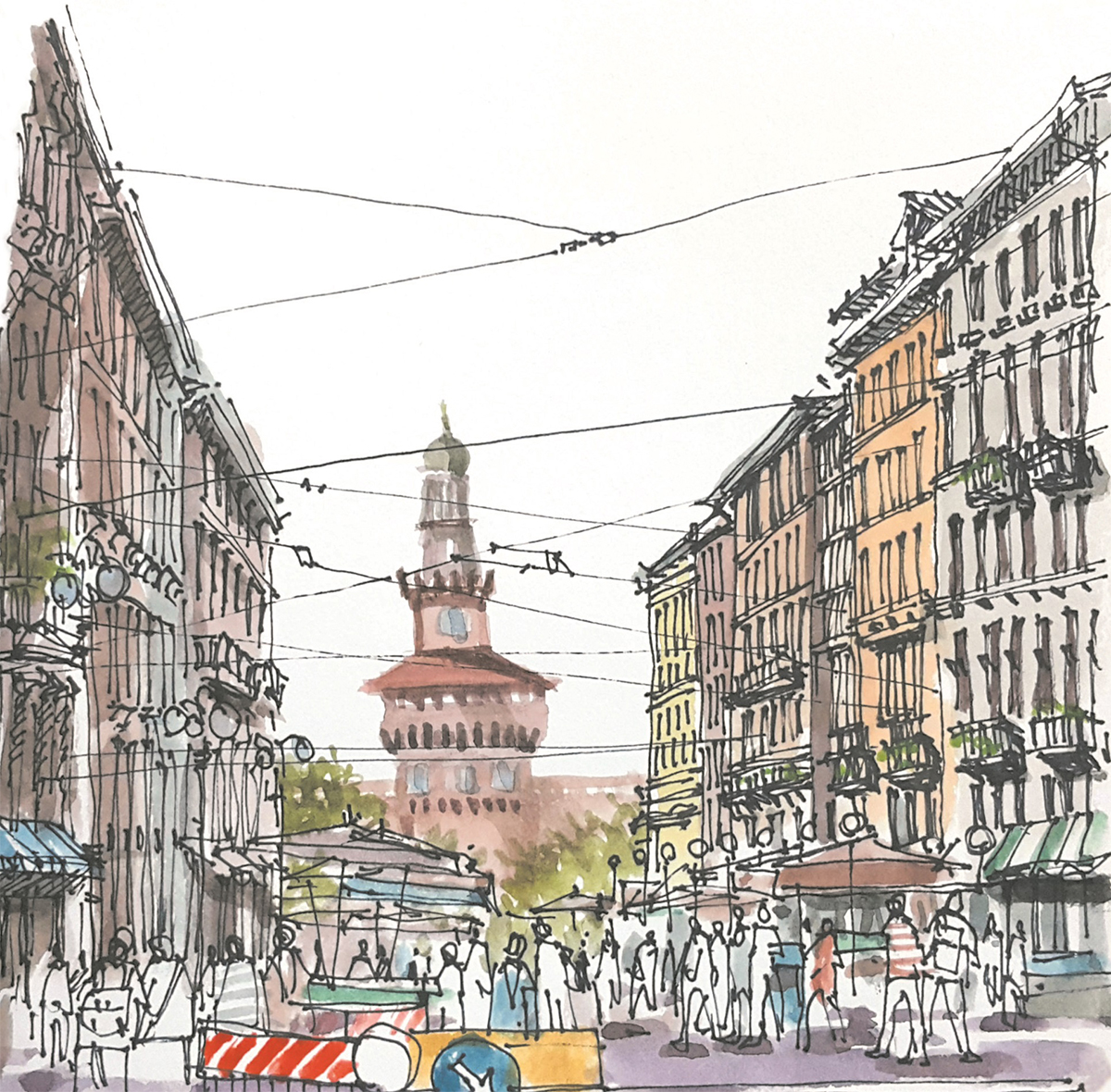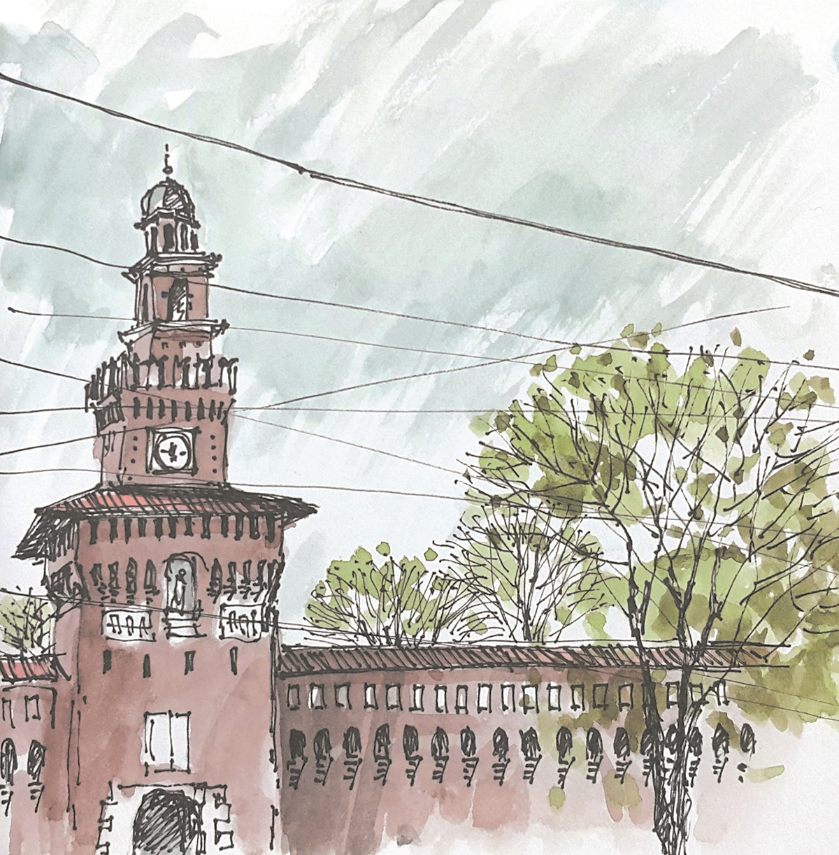 밀라노 두오모성당 도시계획 상 그 전면 광장에서 축을 형성하여 반대 측에는 스포르체스코 성의 위치하는데 빈티지한 벽돌의 성벽은 고색창연하고 그 규모 역시 방대하다.