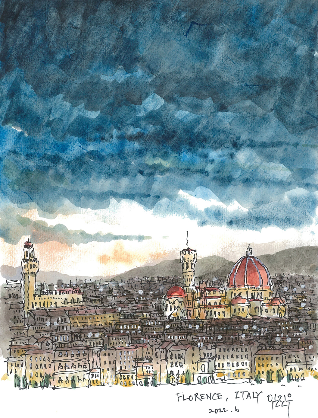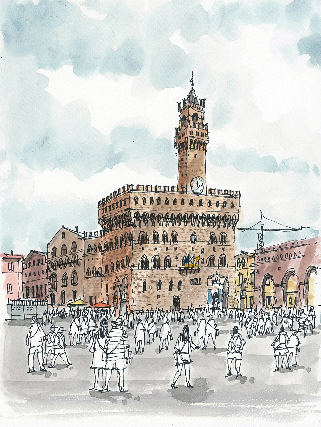 피렌체 베키아 궁 저녁 시간, 미켈란제로 언덕의 광장에는 수많은 관광객들이 모여들고 무명가수는 광장에서 버스킹으로 분위기를 돋우어준다. 이곳에서 조망하는 피렌체는 도심을 관통하는 아르노강 뒤로 거대한 크기의 붉은색 돔을 얹은 두오모 성당과 수직적인 베키오 궁이 오랜 형제처럼 다정한 모습으로 도시를 상징한다. 시나브로 어두워질수록 노을이 번져가는 도시의 야경과 함께 피렌체의 마지막 밤은 아쉽게 저물어간다.