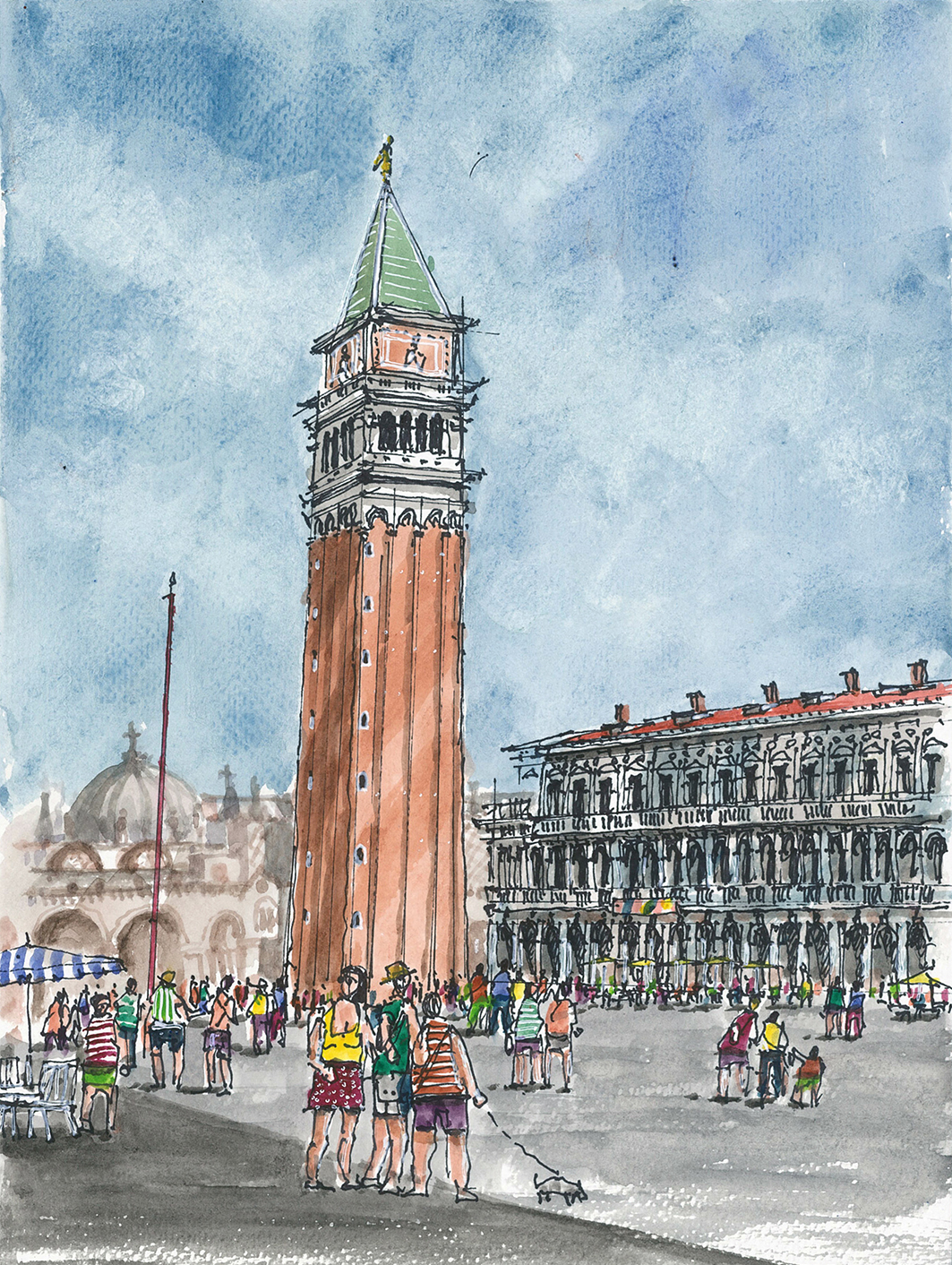 베니스 거리에서 빈티지한 건축물에 감탄사를 연발하며 좁은 골목과 경사진 다리를 건너면 이윽고 산마르코 광장에 도달한다. 마치 조각품처럼 하얀 대리석으로 지어진 대규모의 산마르코 대성당과 수평적 청사에 의해 ㄷ자로 이루어진 위요된 넓은 광장, 그리고 베니스에서 가장 높은 99m99m 높이의 수직적인 붉은 종탑의 총체적인 배치 구성에서 이방에서 온 건축가의 머릿속 에는 경이로운 느낌표가 날아온다.