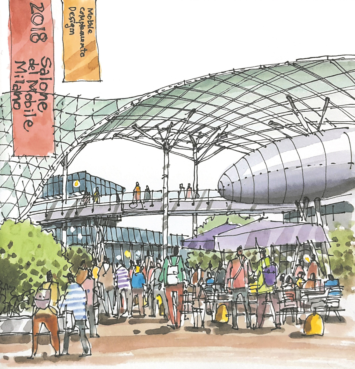 밀라노 박람회장 컨벤션 센터 전시장의 건축디자인도 현대적 기술력이 결합되어 완성도가 높다. 10개가 넘는 각 전시장의 매스를 연결하는 스카이브릿지 상부에는 비정형 스카이라이트가 파도처럼 출렁거리는 이미지로 만들어져 역동적인 미래도시를 연상케 한다. 바닥에는 공항 여객터미널에서 봄직한 무빙워크로 대규모 인원을 실어 나른다. 길 찾기를 도와주는 각종 사인물의 디자인과 편익시설들도 매우 인상적이다.