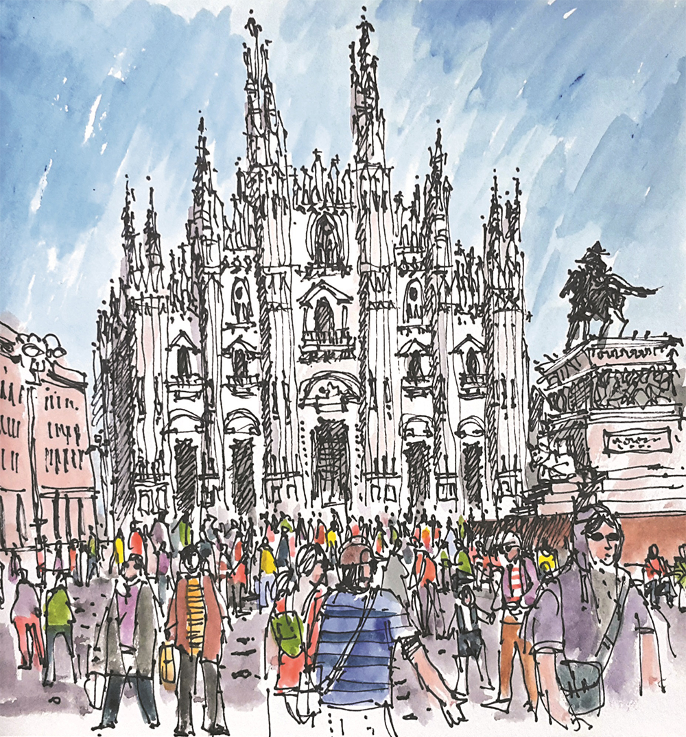 밀라노 시가지 밀라노 관광의 압권이라고 할 수 있는 밀라노 두오모 대성당은 고딕 양식으로 수직적인 모티브의 백색 대리석으로 지어져 그 위용이 대단하다.