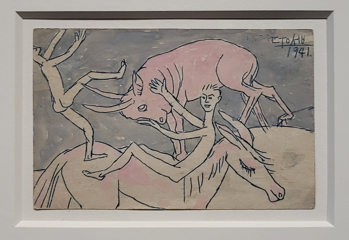 운명처럼 서로에 끌려 연애를 한 둘의 모습이 이중섭의 작품들에서도 볼 수 있다. <상상의 동물과 여인>, <여인> 등 마사코를 모델로 한 작품들도 많이 볼 수 있는데, 그에게 있어 그녀는 뮤즈와 마찬가지인 존재였다. 이중섭과 마사코는 서로 아고리(턱이 긴 이씨라는 의미)와 유비군(발가락 군이란 의미)을 애칭으로 부르며 연애했고, 이 시절 마사코의 다친 발을 치료해준 에피소드가 담긴 작품도 만날 수 있다. 특히 그녀와의 연애시기에 보낸 ‘엽서화’들을 이번 전시에서 많이 볼 수 있었다.