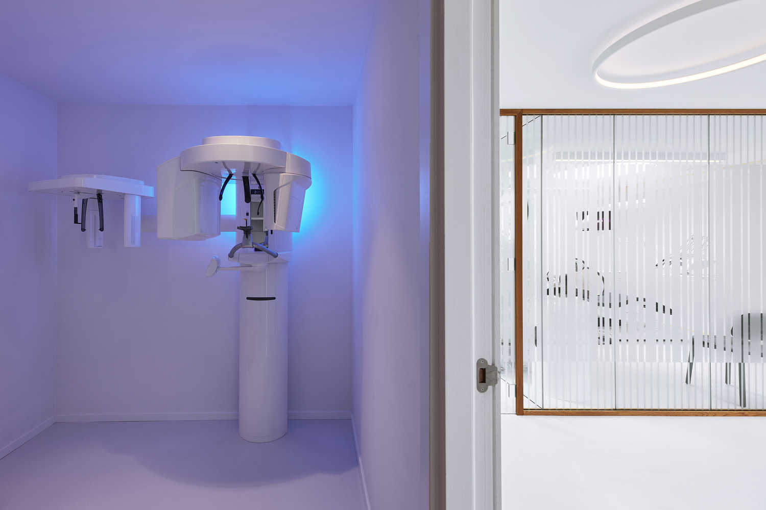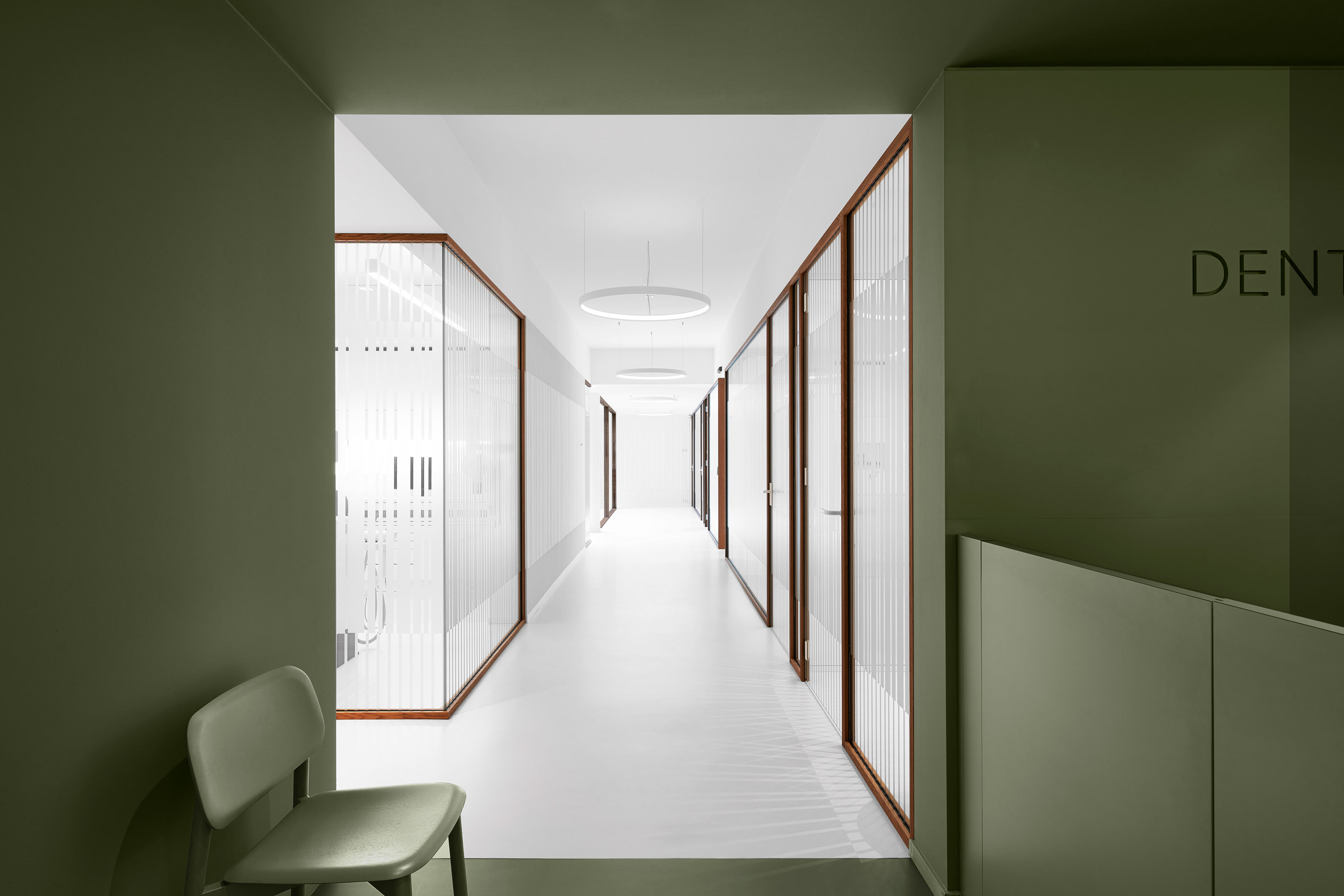 특히 공간의 대부분은 직관적으로 의료 전문성을 드러내는 흰색으로 마감했지만, 안내데스크 주변은 가구에서 천장, 벽 및 바닥에 이르기까지 완전히 녹색으로 마감하였다. 흰색 복도는 진료소 뒤쪽으로 이어지며, 반투명 줄무늬가 있는 유리 칸막이벽이 치료실을 둘러싸고 있어 채광은 확보하되, 환자의 사생활을 보호할 수 있다. 목재로 마감된 외관의 진료소에 들어서면 가장 먼저 의자 몇 개와 키가 큰 나무 상자 좌석이 있는 대기실이 나온다. 공간의 대부분은 직관적으로 의료 전문성을 드러내는 흰색으로 마감했지만, 안내데스크 주변은 가구에서 천장, 벽 및 바닥에 이르기까지 완전히 녹색으로 마감하였다. 흰색 복도는 진료소 뒤쪽으로 이어지며, 뒤쪽의 특별실에는 엑스레이, 살균실 등 최첨단 기술이 갖춰져 있다. 최신 기술을 완벽하게 갖추고 있는 치료실은 고급 진료를 위해 개인용으로 계획했으며, 반투명 줄무늬가 있는 유리 칸막이벽이 둘러싸고 있어 채광은 확보하되, 환자의 사생활을 보호한다.