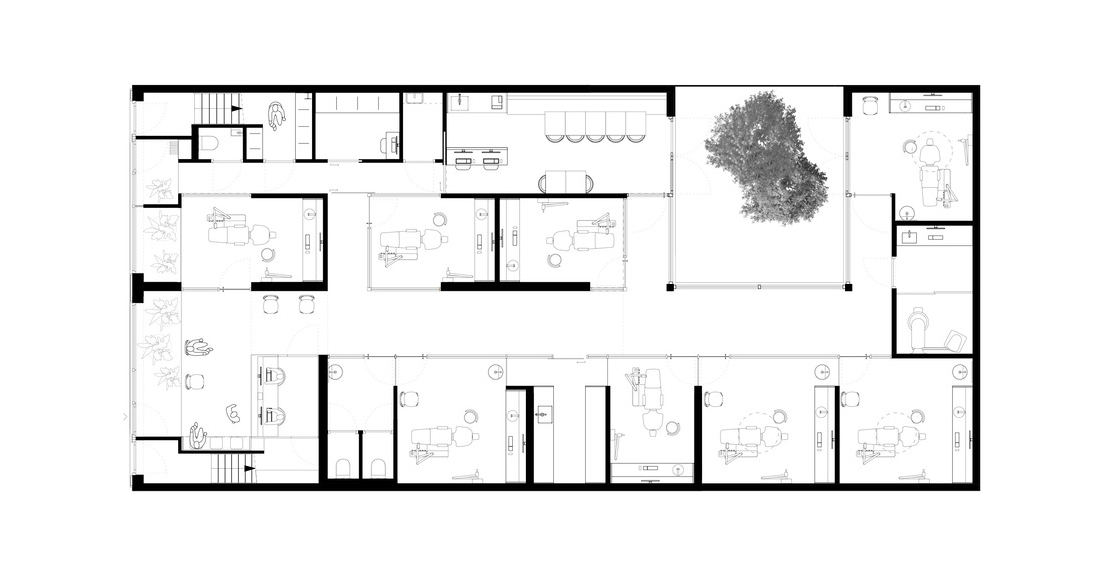 목재로 마감된 외관의 진료소에 들어서면 가장 먼저 의자 몇 개와 키가 큰 나무 상자 좌석이 있는 대기실이 나온다. 울창한 녹지가 외부의 번화한 거리와 대기공간을 분리하는 반면, 날카로운 각도의 녹지 구역과 안내데스크는 대기공간과 치료실을 분리한다.