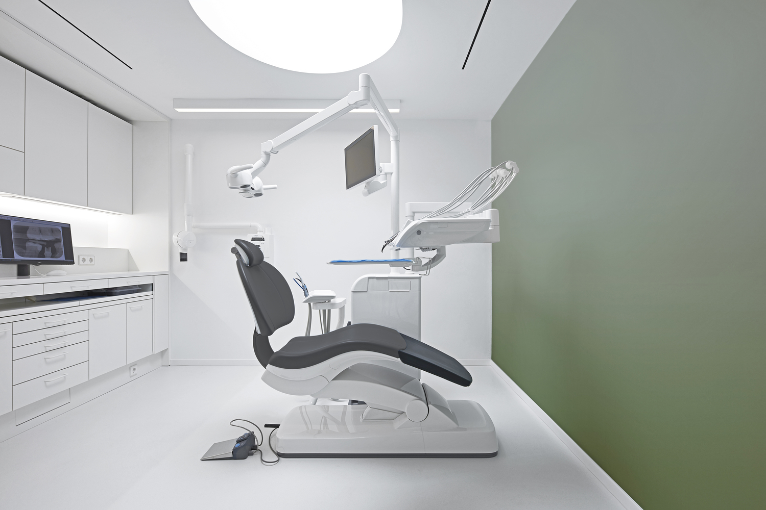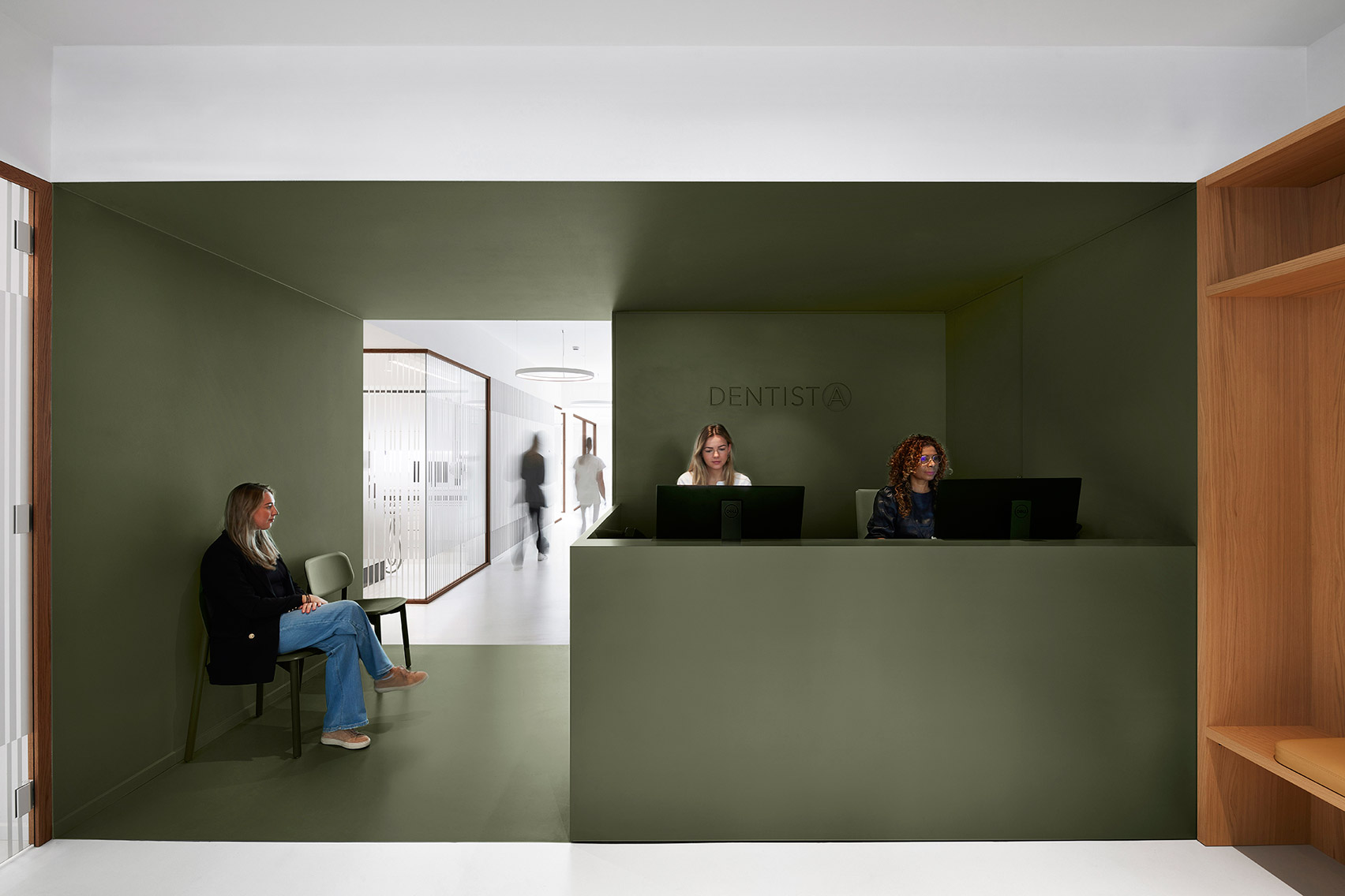 무엇보다 Dentista 치과 체인의 첫 번째 병원인 만큼 i29는 향후 다른 곳에도 적용 가능한 내부 구성과 시각적 브랜드 아이덴티티를 고려했으며, 그 결과 깨끗하고 차분함을 주는 흰색과 녹색을 사용하여 Dentista 치과의 메인이 되는 컬러 블록을 만들었다.