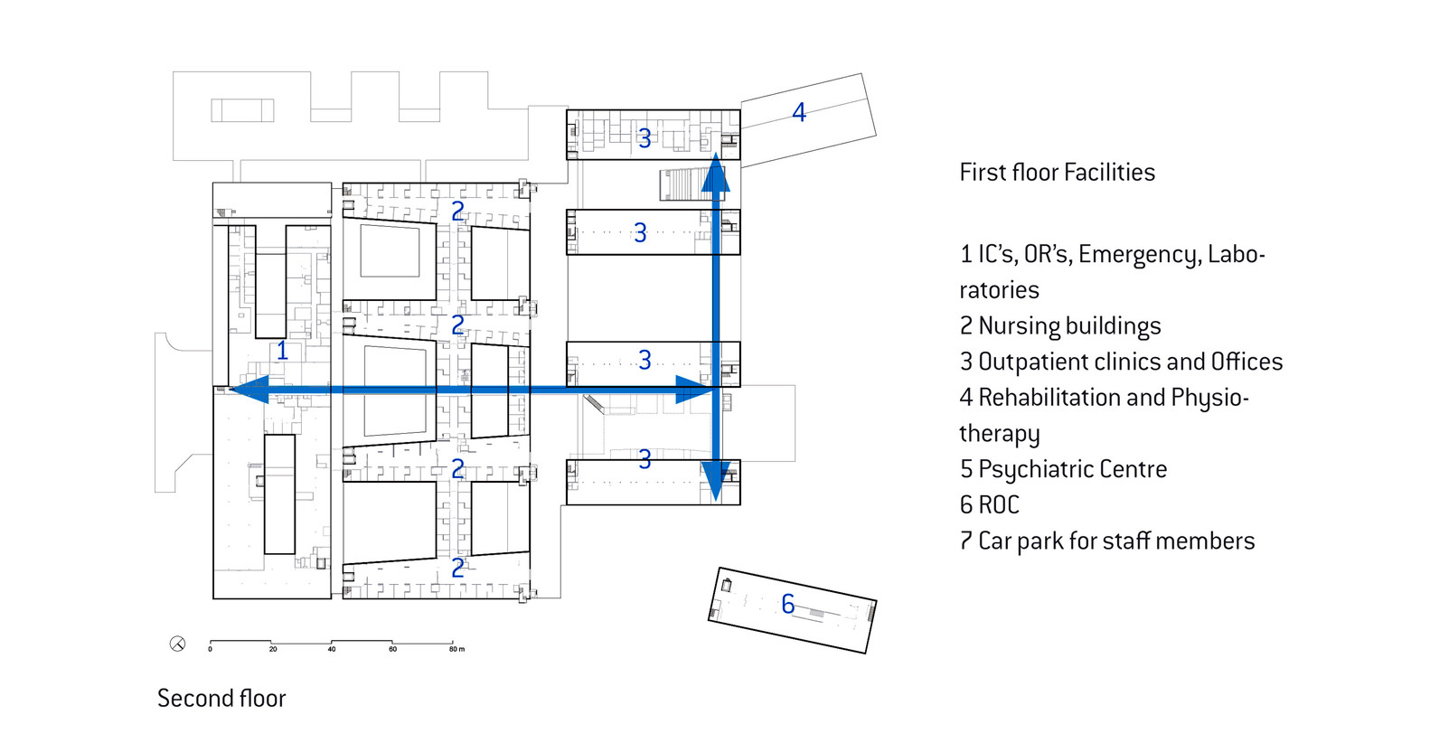 건물의 입구로 들어오면 병원의 모든 오픈 스페이스와 접근을 할 수 있는 거대한 로비가 펼쳐진다. 로비의 양옆에는 유리로 덮인 세 개의 광장이 배치되어 있고, 다양한 공용시설(카페테리아, 약국, 오디토리움, 대기실)이 사용자들의 위치를 알려주는 랜드마크의 역할로서 있다.