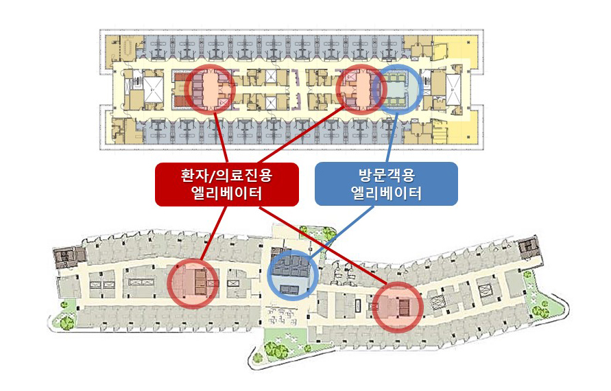해외 병원들을 보면 환자/의료진용 엘리베이터를 층의 중앙이 아니라 각 병동별로 분산시킨 사례들을 볼 수 있습니다. 국내에서는 드물지만, 세브란스암병원과 현재 공사가 준비 중인 원주세브란스병원 새병원이 이러한 사례에 속합니다.