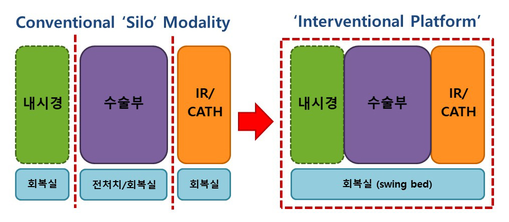 이러한 평면을 구성하기 위해서는 우선 병원 운영이나 부서 체제의 혁신이 필요합니다. 이제까지 사일로(silo)처럼 독자적으로 운영되던 부서들을 통합하는 것은 결코 쉬운 일이 아니기 때문입니다.