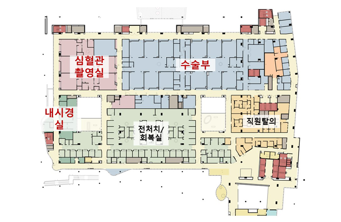 우리나라 병원의 편의시설들은 대개는 지하1층에 배치되는 경우가 대부분입니다. 하지만 이용객 편의나 시설환경 면에서, 또 점차 강화되는 소방안전 면에서도 병원의 편의시설들을 지하에 배치하는 것은 이제 더 이상 바람직하지 않습니다.