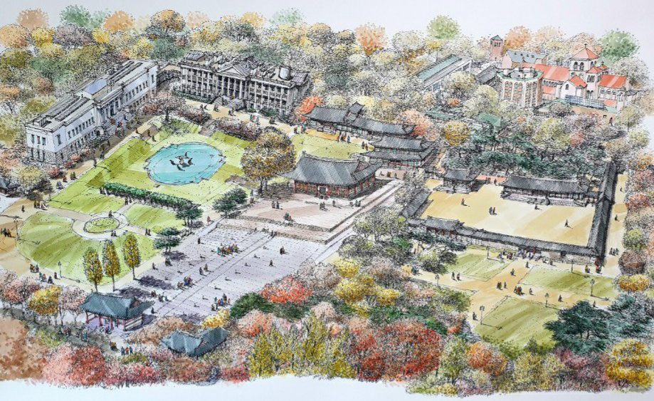 덕수궁 조감도 덕수궁은 조선의 다른 궁궐들과는 다르게 전통과 근대가 만나는 장소다. 정릉동 행궁에서 출발하여 경운궁이 되었다가 덕수궁이 되기까지의 장구한 서사적 이야기가 숨을 쉬고 있다. 특히 고종의 역사가 함께 하고 있는데 덕수궁은 명실 공히 '조선'의 국호를 바꾸고 선포한 '대한제국'의 황궁인 셈이다. 서구문물 수용에 적극적이고 개방적 사고를 가진 고종은 궁궐 안에 르네상스 양식의 서양건축물을 세웠으며 전각 내에도 전화와 전등 같은 신문물을 설치했다. 덕수궁 석조전(현 대한제국 역사관)이 신고전주의 건축양식으로 지어진 것은 새롭게 출발하는 대한제국이 서구의 근대국가를 모델로 하고 있음을 천명했음이다. 서관은 현재 국립현대미술관의 분관으로 활용되고 있다.