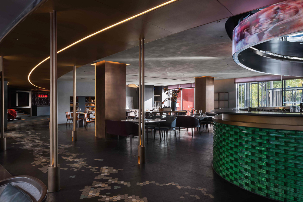 건축가는 공간에 활력을 더해 이 공간을 찾은 이들이 이곳에서만큼은 활기찬 삶으로 돌아가기를 바랐다. 그리고 이를 위해 바닥부터 천장까지 이어지는 큰 창이 내 공원의 풍경을 실내로 끌어들이고, 레스토랑과 자연환경의 경계를 흐리게 하도록 설계했다. 이에 더해 중앙 바 영역의 경우, 거침과 정교함이 공존하는 유리벽돌과 감각적인 질감의 페인트로 공간에 풍부한 공간감과 변화의 가능성을 부여했다. 두 가지 재료 모두 낮에는 자연광을 머금으며 흥미로운 가상과 현실감을 선사하고, 빛나는 벽돌은 해가 지면 따뜻하고 조용한 내부의 빛을 발산하기도 한다.