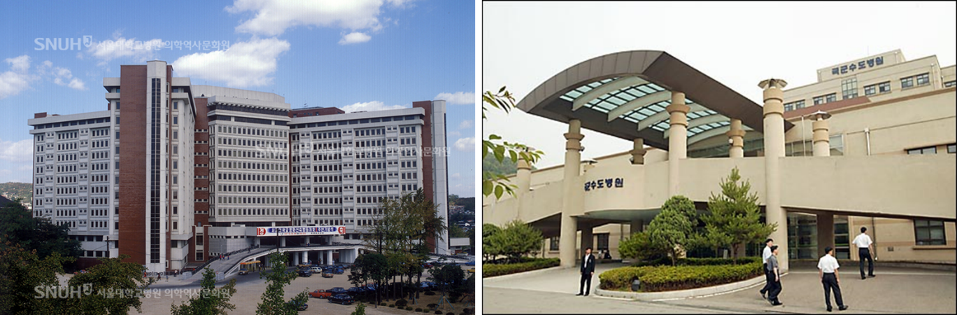 [서울대학교병원 준공 당시 사진(1978년)과 국군수도병원] 여담이지만, 서울대학교병원의 준공식 때 사진을 보면 2층으로 진입하는 램프가 있었습니다. 그런데 이 램프는 2층의 외래로 오는 내원객들을 위한 별도의 램프였다고 합니다. 만약 그러한 목적이었다면 지금 생각해도 대단한 환자중심적 디자인이었던 것 같습니다.