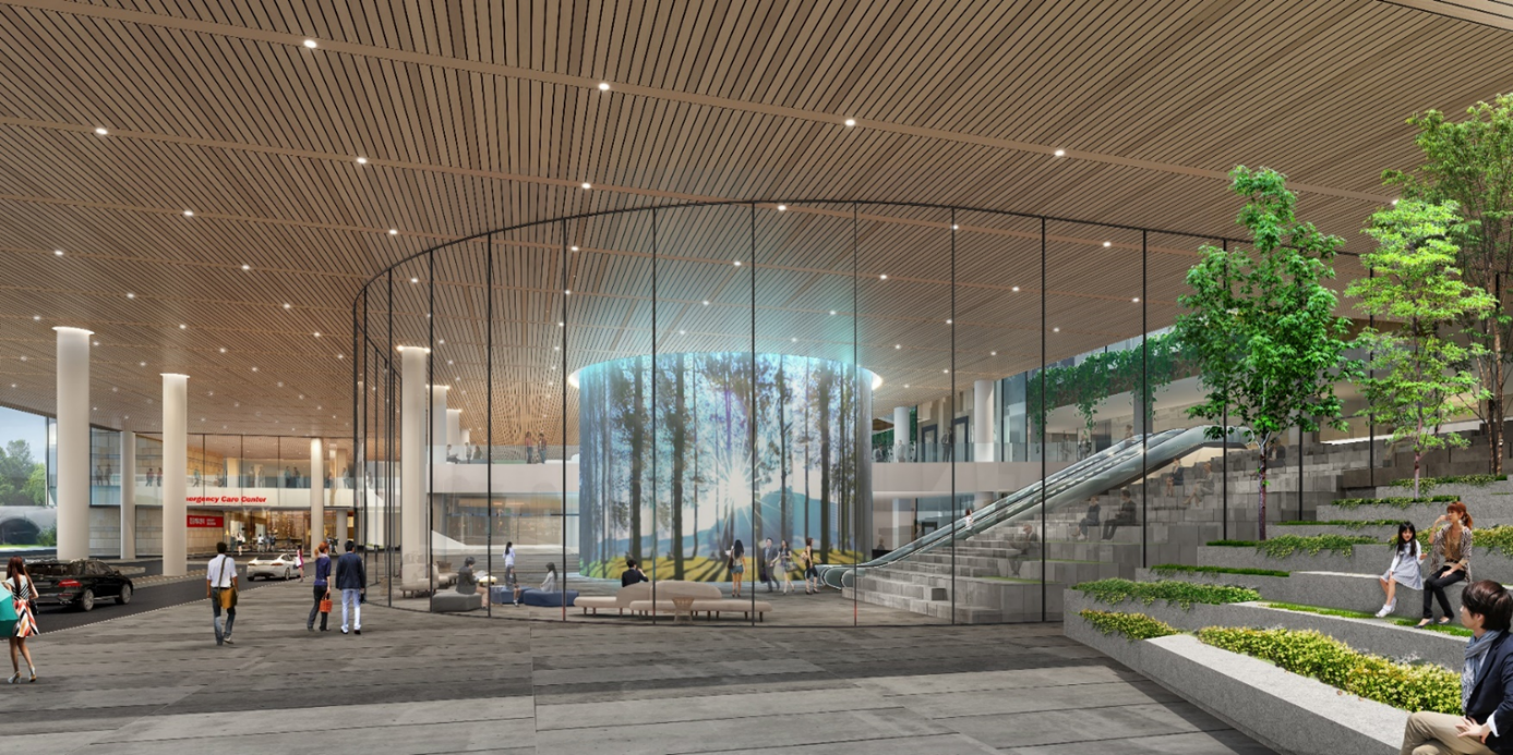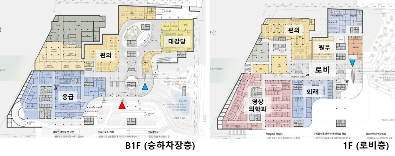 우리가 알고 있는 병원의 로비는 내원객들이 차에서 내리는 1층에 배치하는 게 일반적입니다. 대지가 평평하고 넉넉한 면적을 확보할 수 있다면 당연히 승하차장과 로비는 1층에 배치해야죠. 그런데 만약 대지조건이 병원의 승하차장 레벨에 로비를 만들기 곤란할 경우에는 어떻게 해야 할까요?