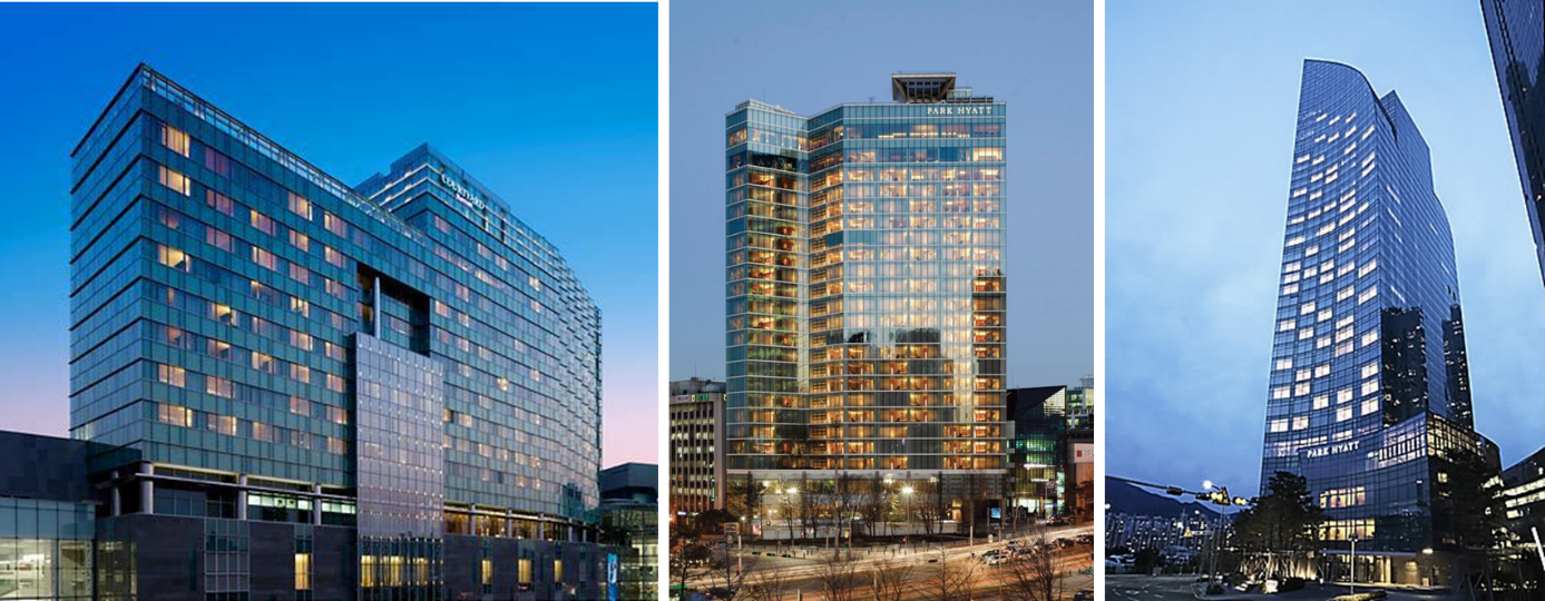 [로비를 건물 중간이나 최상층에 배치한 국내 호텔들] 영등포 타임스퀘어의 코트야드 바이 메리어트는 5층에 리셉션 홀이 배치되어 있고, 강남구의 파크 하얏트 호텔은 로비를 최상층인 24층에, 부산 해운대의 파크하얏트 역시 바다가 한눈에 내려다보이는 30층에 로비가 배치하고 있습니다.