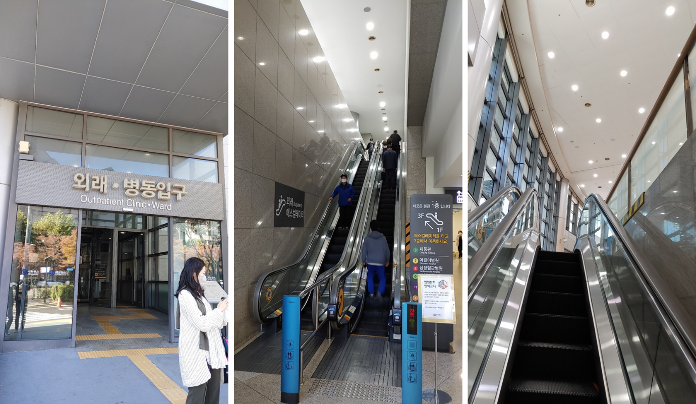 이 부출입구는 3층 승하차장까지 멀리 돌아가는 대신, 전면 도로변에서 내려 병원 안으로 진입하려는 내원객들이 많이 이용합니다. 위 사진에서 보듯이, 이곳 부출입구에서는 들어서자마자 에스컬레이터를 타고 2개 층을 올라가 로비와 연결됩니다.