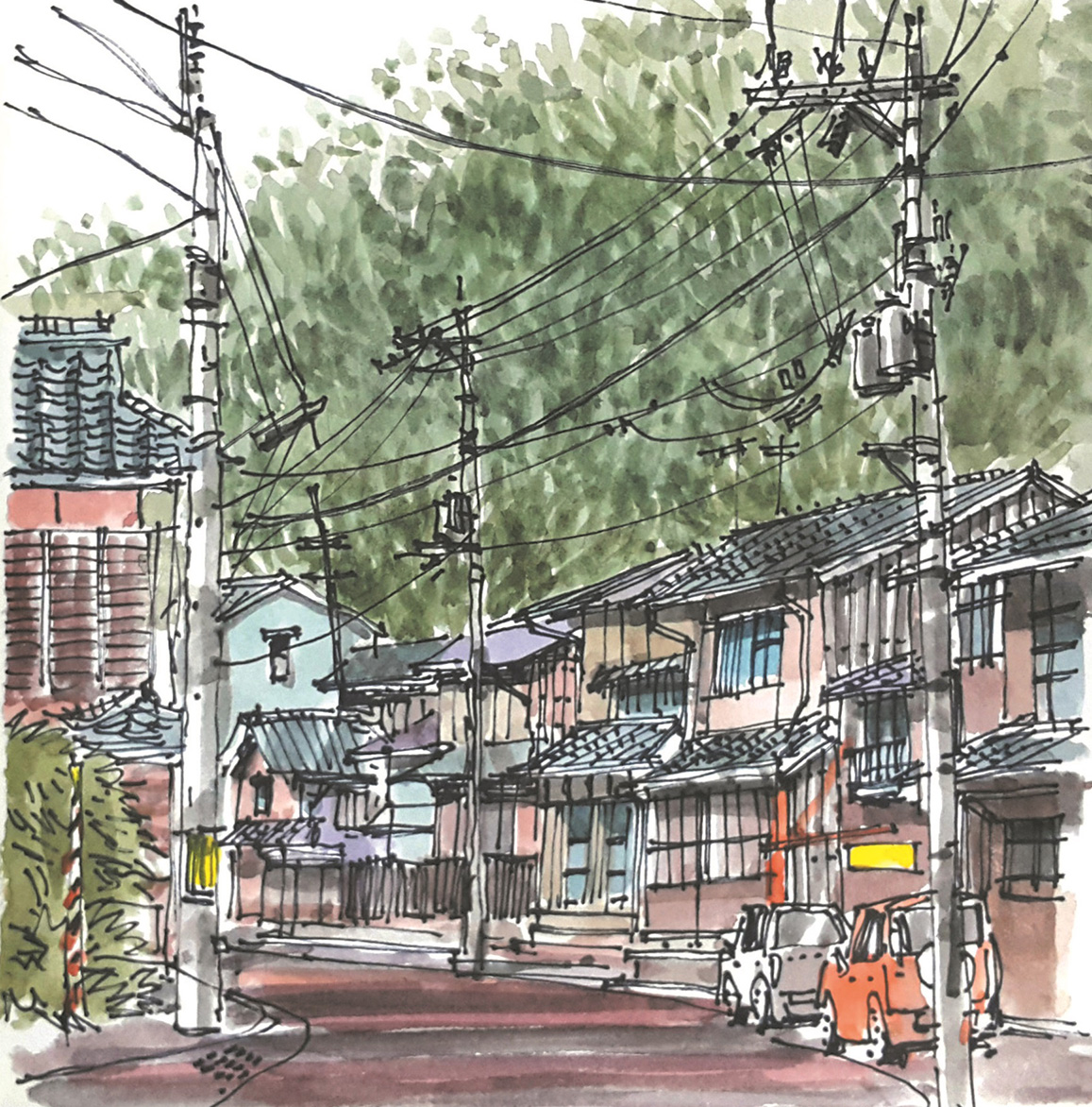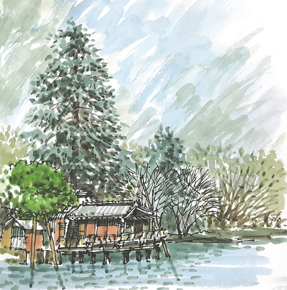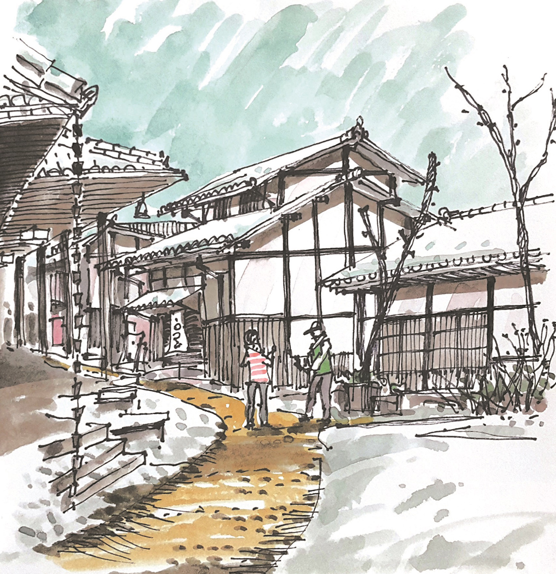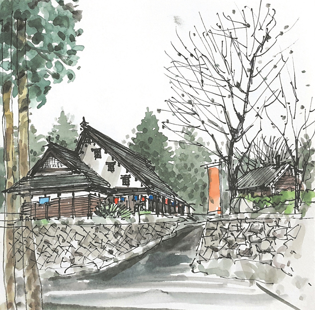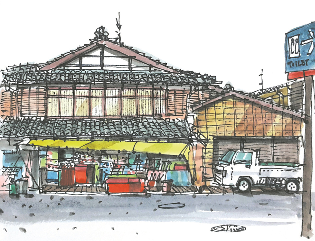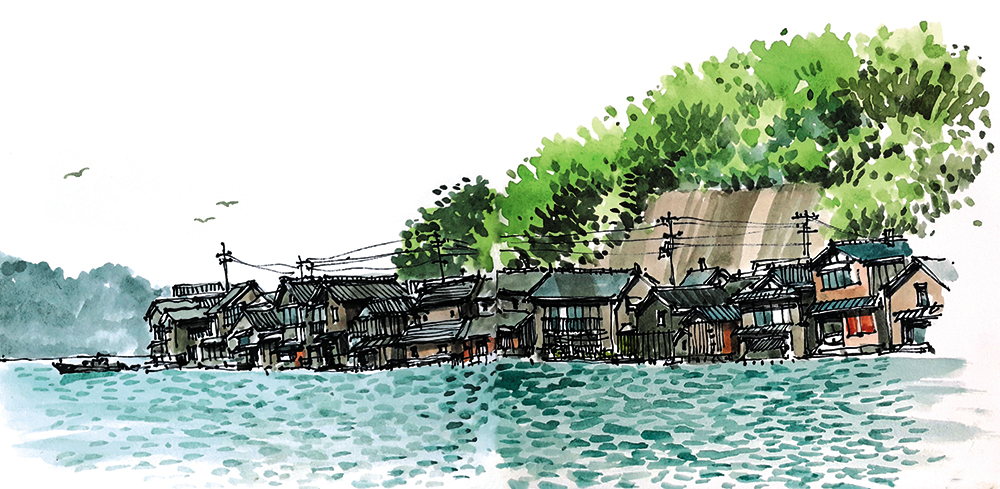 일본 이네노 후나야 하필 여우가 시집을 간다는 변덕스러운 날씨에 답사했음에도 불구하고 이 곳은 마치 정지된 시간의 공간처럼 한적하고 느긋하다. 여유를 가지고 천천히 마을길을 따라 걷다가 당도한 찻집에 앉아보니 평화로운 수상가옥들의 풍경이 한눈에 포착되고 고즈넉한 바다마을에 시선을 빼앗긴다. 일행들도 각각 거리를 두고 대화를 멈춘 채 이 풍경에 도취되어 바라보며 생각에 잠겨있다. 감동적인 풍경에 마음이 움직이는 이 시간은 모두 명상에 잠긴 듯 적요하다. 각자 질주해 온 삶의 속도를 조절하고 거칠어진 마음속을 치유하기에 안성맞춤이다. 나도 역시 일상 속 재충전의 기회로 삼아 먼 수평선에 시선을 고정한 채 시간을 보내며 스케치북에 풍경을 옮겨본다. 수평선에 걸려있는 평화로운 고깃배와 하늘을 배경으로 갈매기들의 여유로운 비행조차 느림의 미학이 공존하는 곳이다.
