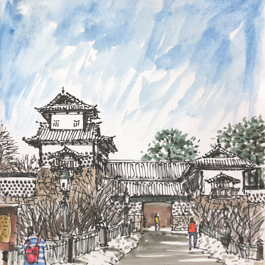 일본 가나자와 가즈메미치 치야가이 이번 답사여행의 주요 도시인 가나자와는 전형적인 일본의 중세도시 혹은 역사도시로 인식되는데 사찰이나 성을 중심으로 발달한 도시다. 전쟁이나 대규모 지진의 피해를 입지 않아 교토에 이어 일본의 전통건축도 잘 보존되어 있다. 거기에 더해서 신도시 개발을 병행하여 전통과 현대가 조화를 이루는 도시를 추구하고 있다. 아직 추운 날씨라 잔설이 남아있는 가나자와 성은 품격과 위엄이 있다. 인근에 일본 3대 정원으로 꼽히는 겐로쿠엔 등 중요한 문화유산이 많이 남아있어 ‘작은 교토’라 불리고 있다. 이 겐로쿠엔의 산책로도 눈이 녹지 않아서 바닥은 미끄럽지만 종종걸음으로 넓은 정원을 돌아보는 것도 색다른 즐거움이다. 이른 아침 무거운 카메라를 어깨에 메고 설경을 사냥하러 나오신 사진애호가 그룹들이 눈에 띈다. 풍경이 뛰어난 넓은 호수를 중심으로 수백 년을 살아온 노송들이 저마다 카메라 앞에서 수형을 자랑한다.