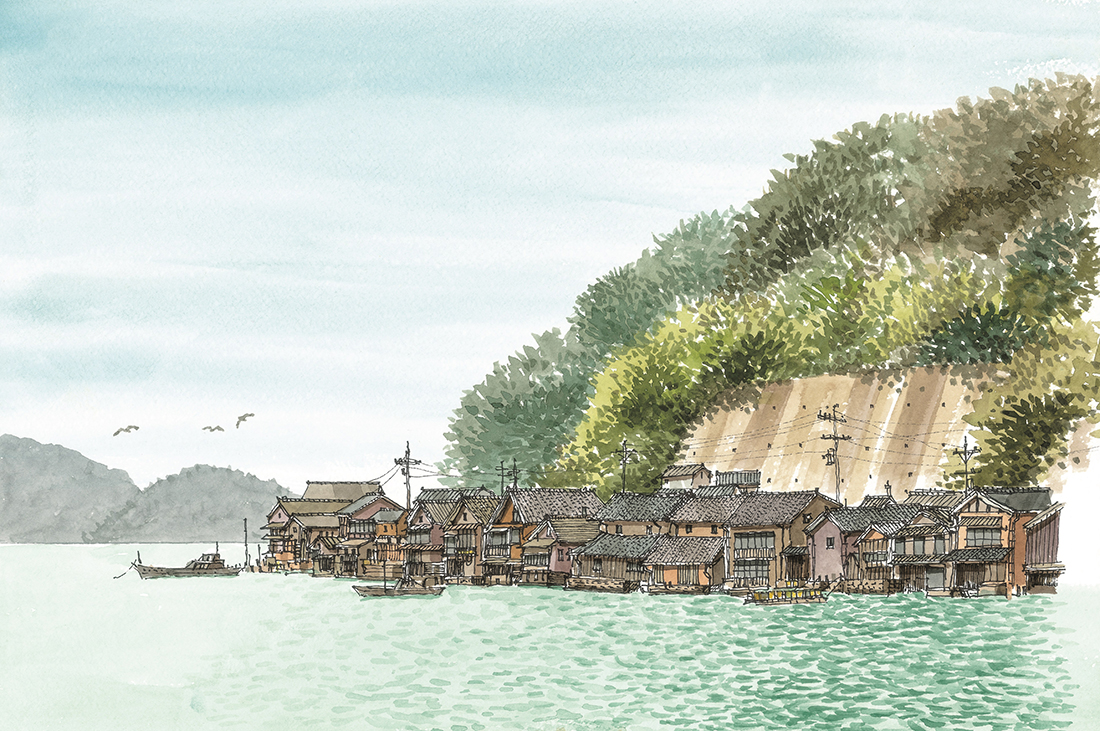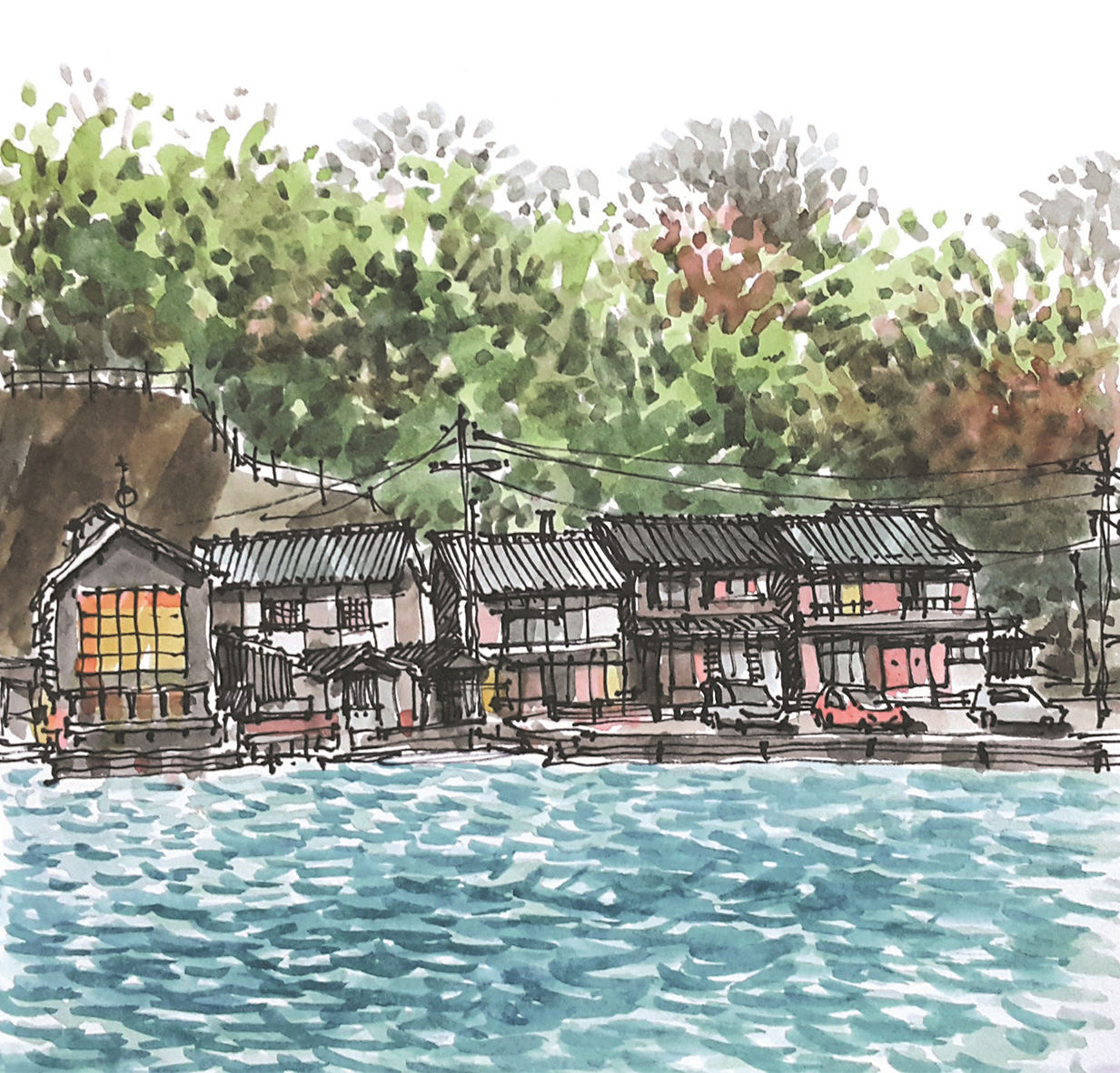 남쪽으로 만을 형성하고 있어서 접해있는 바다는 파도가 유난히 잔잔하다. 후나야라고 불리는 경사지붕의 수상가옥들이 촘촘하게 군집을 이루고 있는데다 잘 보존된 일본특유의 빈티지 전통목조건축들이라 인기가 높아져 점 점 방문객들이 늘고 있는 추세이다. 이 곳은 급경사의 산을 배경으로 하고 있어 바다와 산 사이의 좁은 경계를 두고 오랜 세월 동안 선형으로 길게 마을이 형성되었고 좁은 차로 하나가 동네를 연결해 준다. 물과 산, 옹기종기 마주하고 있는 어촌풍경은 그림으로 표현하기에 안성맞춤이다.