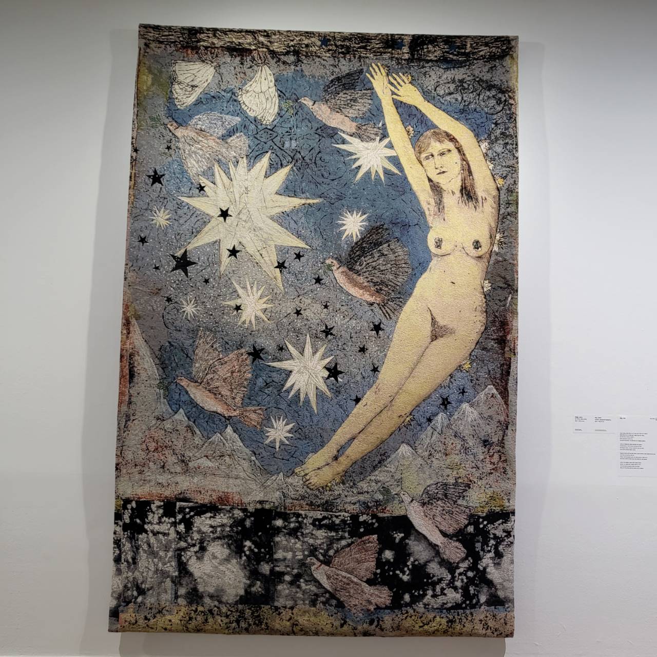 [하늘, 2012, 면 자카드 태피스트리] 키키 스미스는 자신의 예술활동을 ‘정원 거닐기’라고 종종 표현했다. 여러 주제와 매체를 넘나들면서 표현해 내는데 전시회를 보고 나와서 그 앞에 모니터에서 그녀의 작품제작 과정과 인터뷰가 담긴 다큐 영상을 봤다.