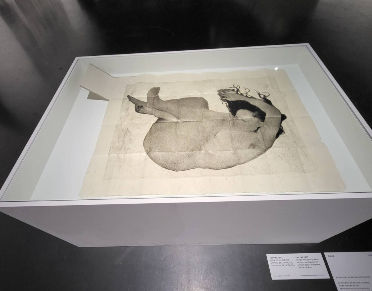 [꿈, 1992, 에치젠 고조 기즈키 종이에 2색 요판 인쇄] 키키 스미스(Kiki Smith)하면 따라왔던 키워드인 ‘애브젝트 아트(Abject art)’. 비천하다고도 표현되는 애브젝트는 주체도 객체도 아닌 상태로 사회나 환경에서 배제된 대상을 칭하며, 이를 예술로 만들어내는 것을 말한다. 신체의 일부, 신체의 배설물, 동물의 사체 등을 통해 복합적 감정을 경험하게 하는 것. 그 감정을 이번 전시회에서도 오롯이 만나볼 수 있었다. 물론 초기의 키키 스미스 하면 떠오르는 직접적이면서 자극적인 작품들은 많이 없었는데, 그래서 개인적으로는 더욱 편하게 전시에 집중할 수 있기도 했다.