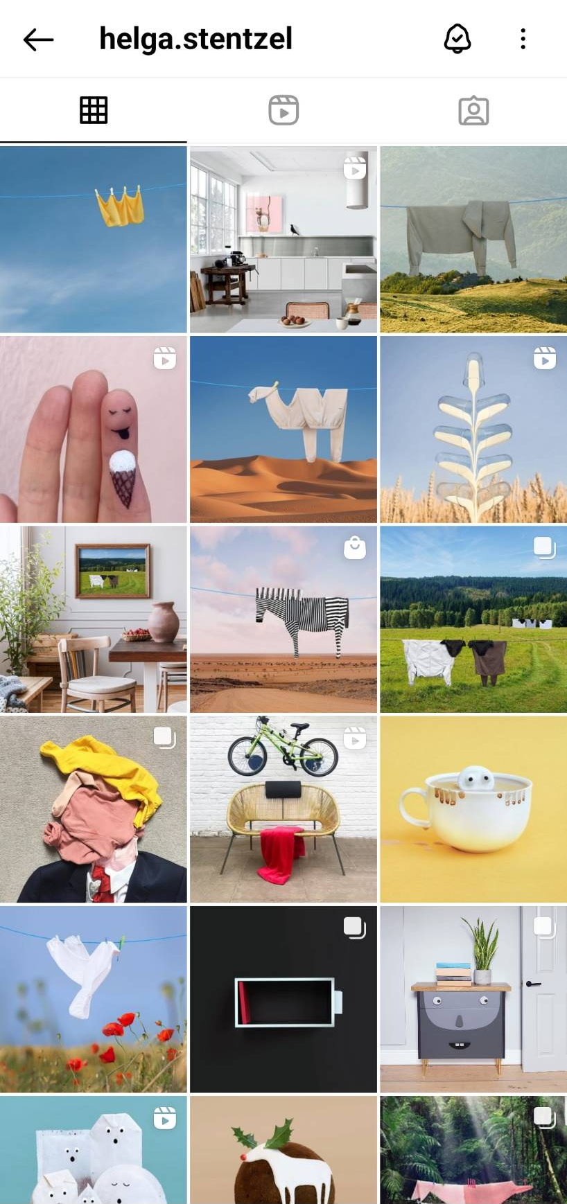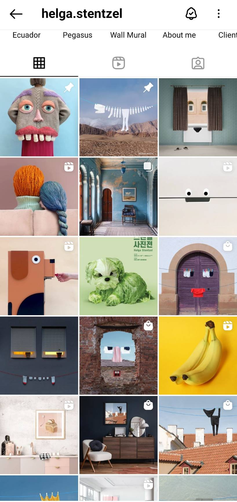 [헬가 스텐첼 인스타그램 피드] ‘집 안의 초현실주의’라 불리는 그녀의 작품들 역시 기발함이 가득해서 일상을 살아가다가 그의 작품들을 피드에서 보고 힐링을 얻기도 하기 때문이다. 스텐첼은 양상추로 강아지를 만들고, 아이스크림 위에 초코고양이를 만들고, 식빵으로 강아지를 만들어낸다. 빨래로 송아지를 표현해 내기도 했는데, 획일화된 생각을 이렇게 깰 수 있구나 싶고, 또 한편으로는 우리는 우리가 보고 싶은 것만을 보는구나 싶은 생각이 들기도 한다. 단순한 빨래인데 거기서 소를 찾고, 식빵에서 강아지를 찾아내니.