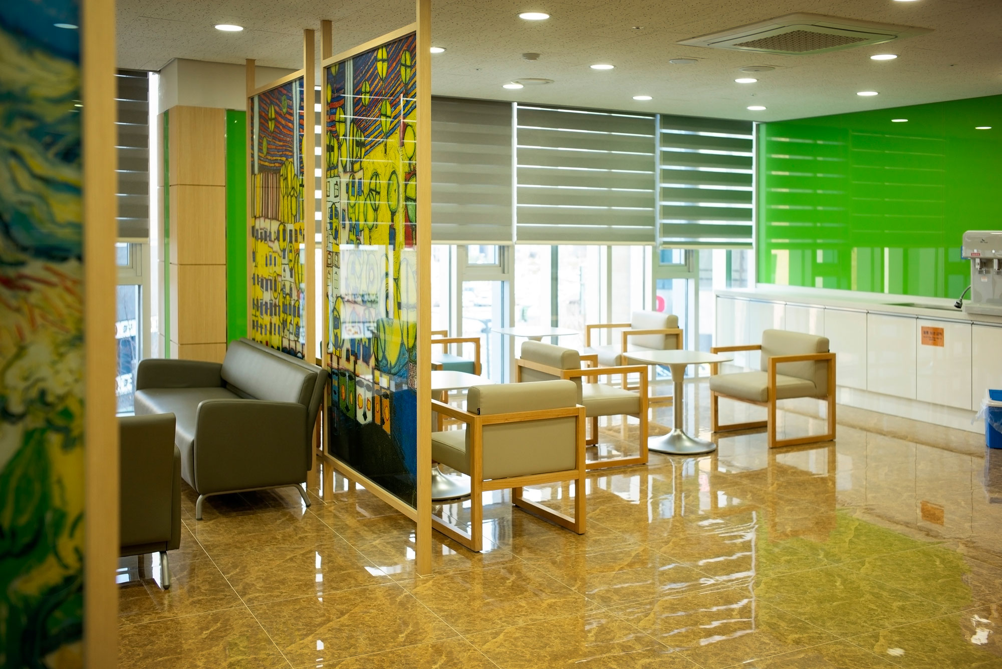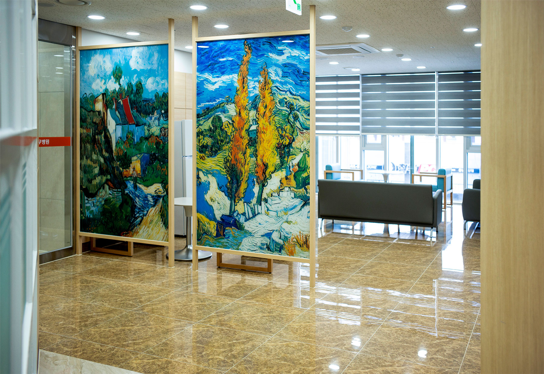 아산충무병원은 설계 기간만 1년 10개월이 걸렸습니다. 그 이유는 의료원장님과 경영진들이 설계에 직접 참여하여 동선이나 내부 소재 등을 일일이 체크하셨습니다. 당시 의료원장님께서는 경영진들과 대구파티마병원이나 대전성모병원 등을 포함해 전국에 있는 병원들을 모두 순회하시며 환자 입장에서 좋은 부분들을 면밀히 파악하셨습니다. 그때마다 수정·보완하다 보니 긴 시간이 소요되었습니다. 설계는 예전부터 우리 병원 설계를 담당하셨던 설계사분이 계속 진행하셔서 지금은 거의 전문가 수준입니다. 설계 모토는 ‘환자가 병원에 들어왔을 때 긴장감과 불쾌감 없이 편안함을 느낄 수 있는 병원이 되는 것’입니다. 이를 위해 환자의 동선을 최소화하고 병원 곳곳에 명화를 적용해 넣었습니다. 의료원장님은 환자가 병원에서 불안감을 느끼지 않고 중간마다 심리적 안정감을 주기 위해 그림을 걸어야 한다고 말씀하셨습니다. 또한 내부에 페인트를 칠하지 않고 백페인트 글라스로 마감했습니다. 이것 역시도 의료원장님이 보시기에 페인트는 삭막한 느낌이 들어 다른 소재를 찾다가 그린 컬러의 백페인트 글라스가 선택된 것입니다.