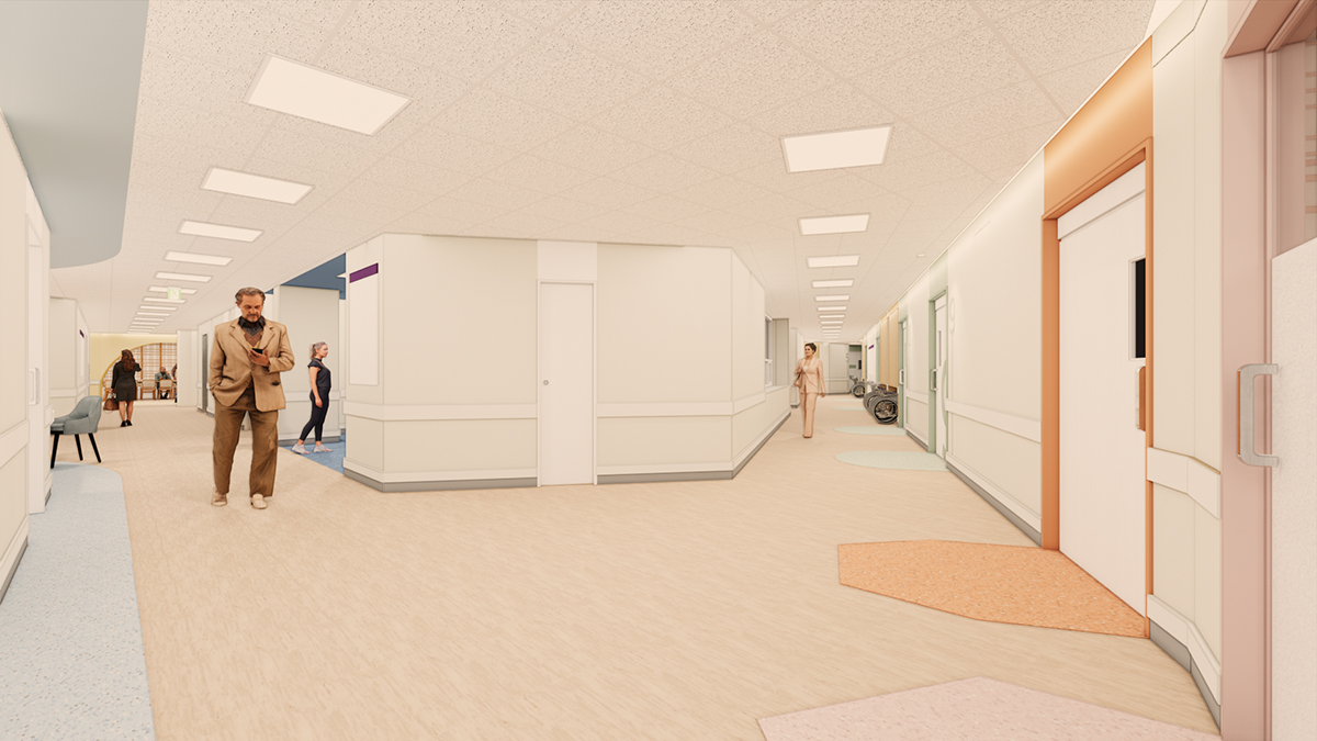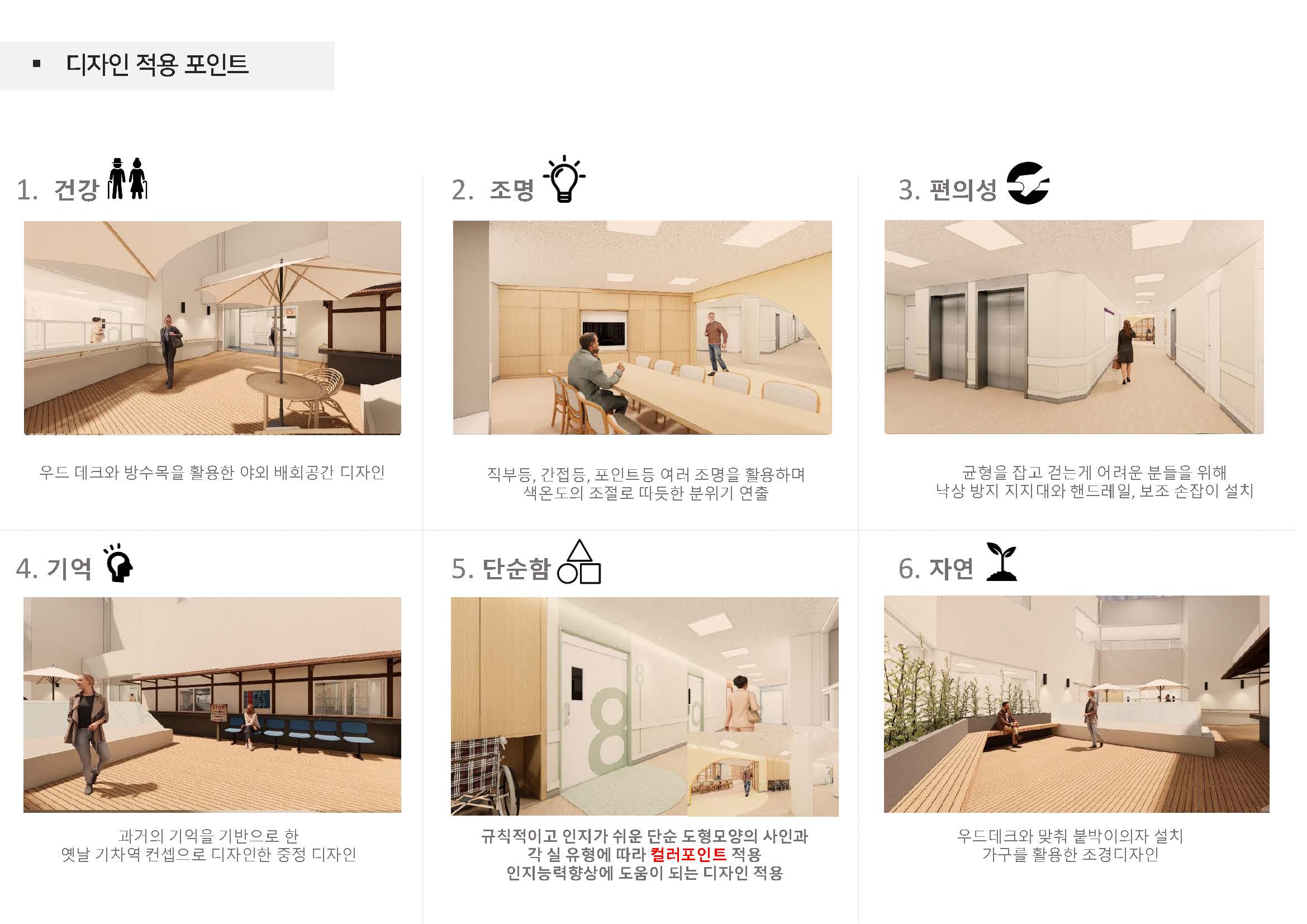 셋째, 조명, 색채, 영상, 음향설비 등을 통한 감각적 환경으로 병동을 구성하여 치매환자 치료에 도움이 되는 환경 제공이 있습니다.