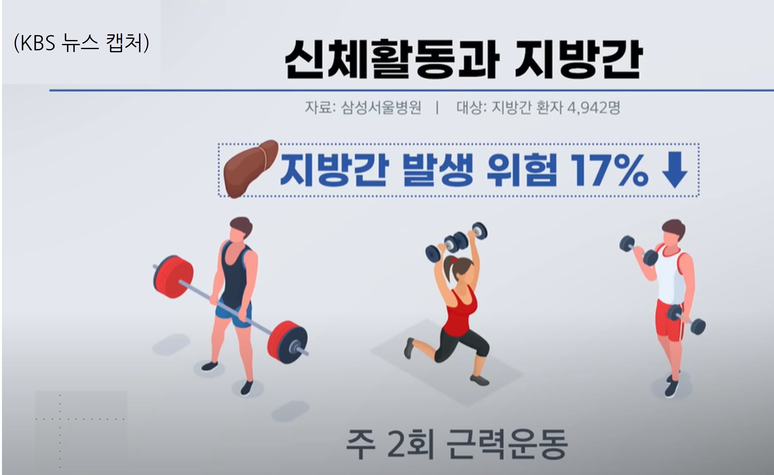 오히려 주 2회 근력 운동을 한 경우 지방간 발생 위험이 17% 낮아진 것으로 나타났는데, 근력 운동을 하게 되면 가장 중요한 변화 중 하나가 뼈라든지 이런 데 자극이 되면서 뼈에서 다양한 호르몬들이 나오는데 호르몬 중 일부는 활성화가 되면 지방간에 굉장히 효과적인 것으로 보고되었다. 따로 시간을 내 운동하는 게 가장 바람직하지만 여건이 안 되면 주 2회 근력 운동만이라도 하는 게 건강에 도움이 된다고 연구진은 밝혔다.