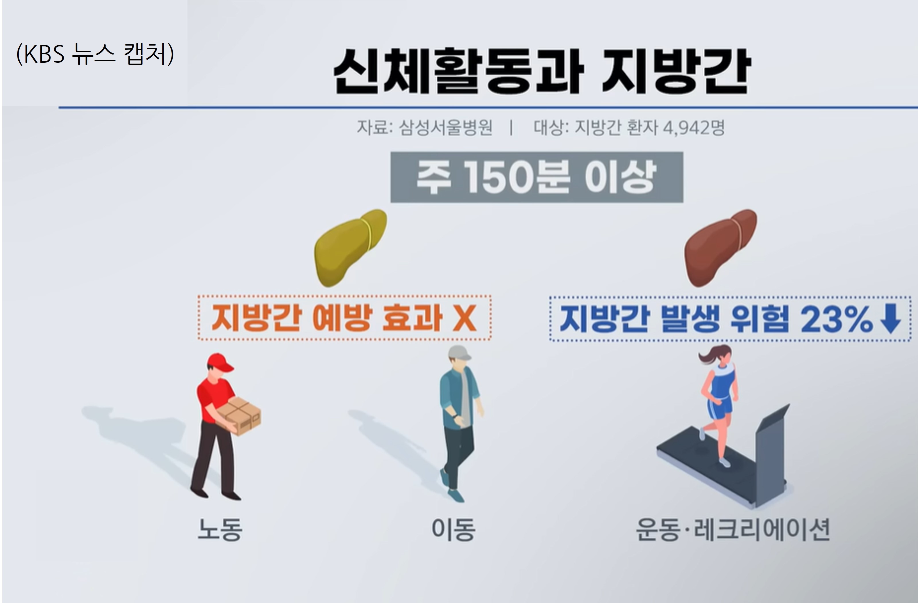 삼성서울병원 연구팀이 지방간 환자 4천9백여 명의 생활 신체 활동 효과를 분석했는데, 위 환자처럼 근무 중 몸의 움직임이 많은 경우나, 출퇴근 걷기 같은 이동을 일주일에 150분 이상 했어도 지방간 발생 위험을 전혀 낮추지 못했다고 한다. 반면 같은 시간 운동이나 레크리에이션 활동을 했을 때 지방간 발생 위험이 23% 낮아진 것과 비교되는 대목이다.