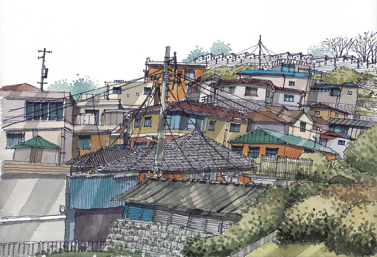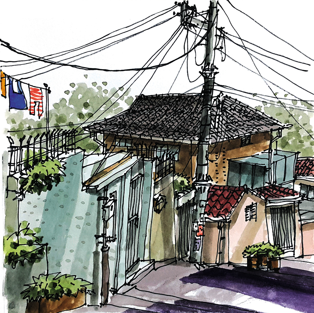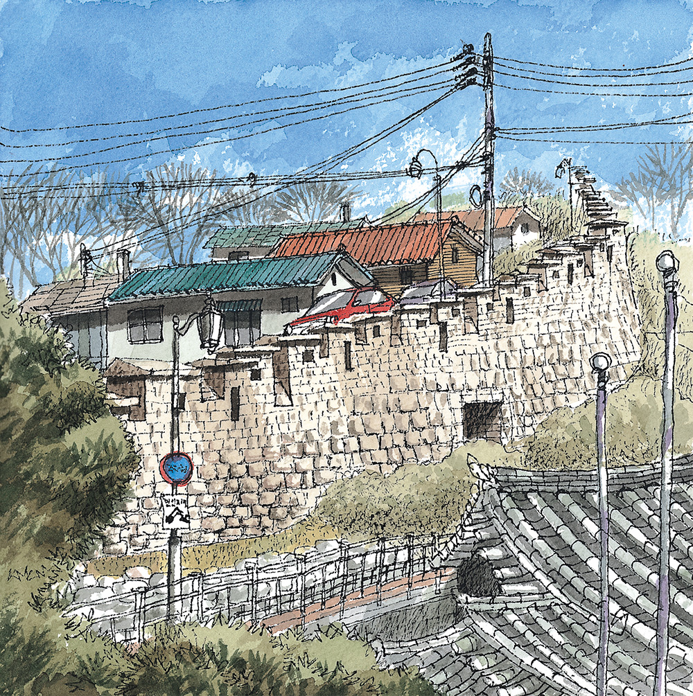 서울장수마을 조선시대부터 빈자들이 움막이나 판잣집을 지으면서 마을이 형성되어서 그런지 낡고 허름한 집들이 아직 일부 남아있지만 오랜 성곽과 함께 시간을 쌓으면서 친근하고 정감이 따스하다. 좁다랗고 경사가 급한 길에 올망졸망 어울려 사는 성곽 밖의 소외된 거주지였지만 최근에는 새롭게 개조하는 집들이 생겨나며 동네에 활력이 생겼다. 성곽위에서 내려다보면 낮은 지붕위로 멀리 시가지가 펼쳐 보이고 아래서 올려다보면 급경사지에 차곡차곡 쌓은 집들은 하늘이 배경이 된다. 전봇대와 전선줄은 주인공은 아니지만 그림을 완성하는데 필요한 씬스틸러(scene stealer) 역할을 톡톡히 해내고 있다.