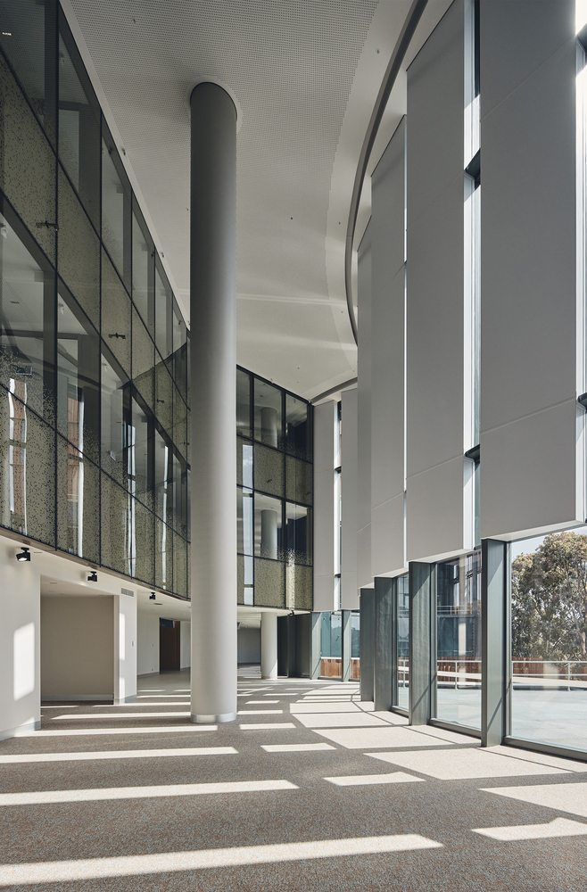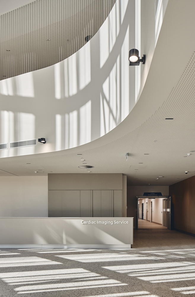 외부의 눈에 띄는 풍화 강철 파사드는 빅토리아 심장 병원을 Monash University의 랜드마크 건물로 설정하는 동시에 나무가 늘어선 풍경 안에 건물이 부드럽게 자리 잡고, 열 부하와 눈부심을 최소화하면서 조망은 확보하도록 했습니다.