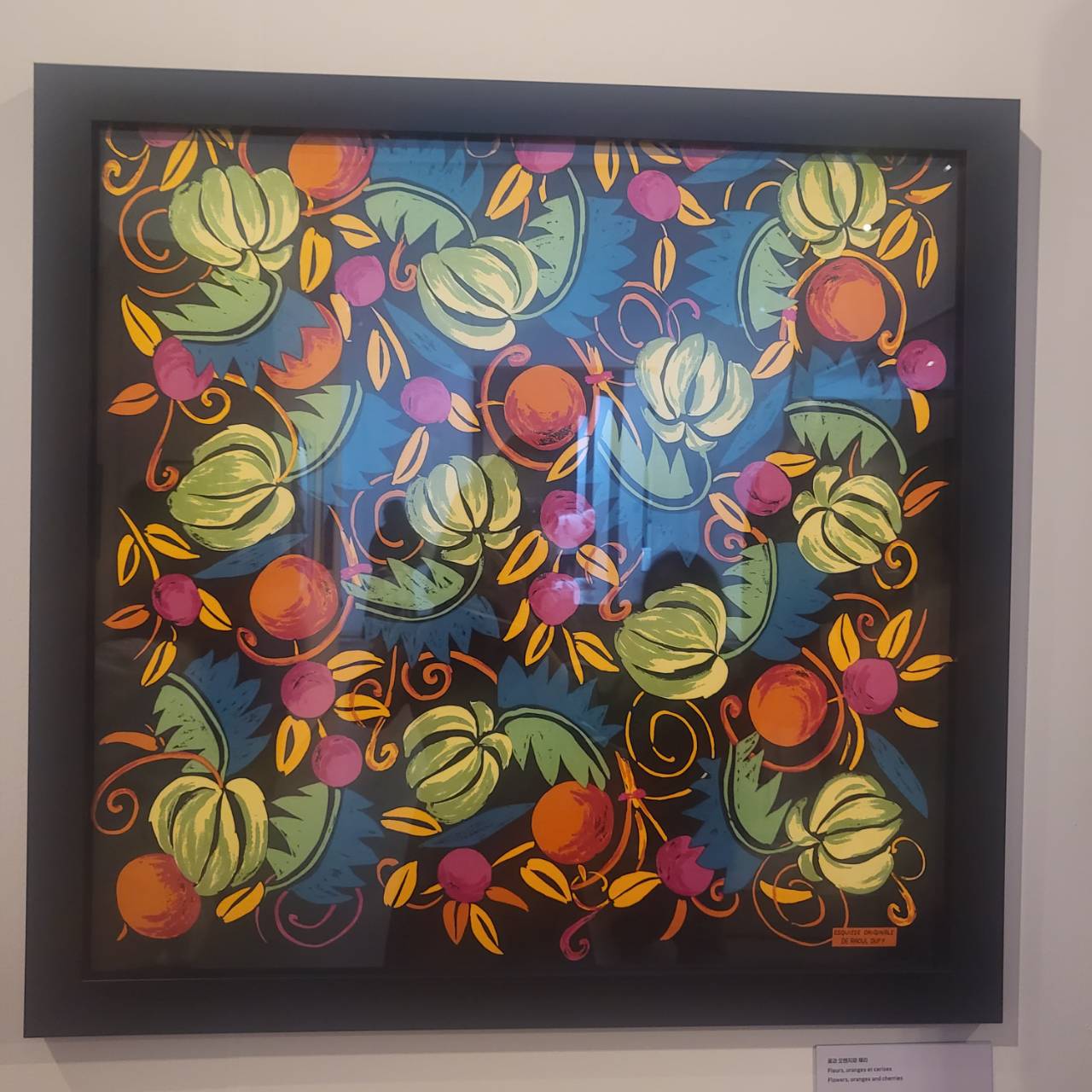 [예술의 전당] 꽃과 아라베스크 [예술의 전당] 꽃과 오렌지와 체리 [예술의 전당] 문양화된 꽃, 잎, 과일, 1911-1914년경 [예술의 전당] 라울 뒤피 드레스 전시 이번 전시에서는 ‘깃발을 장식한 배들(1946)’ 등 생애 마지막에 그렸던 바다 그림들이 대거 공수 되어서 눈을 즐겁게 해주었다. 개인적으로 본인 역시 바다에서 태어나서 바닷가 풍경 작품들이 더 끌리는 듯했다. 삼각형으로 표현한 파도가 너울거리는 푸른색 바다에 푹 빠져있었던 시간이었으니.