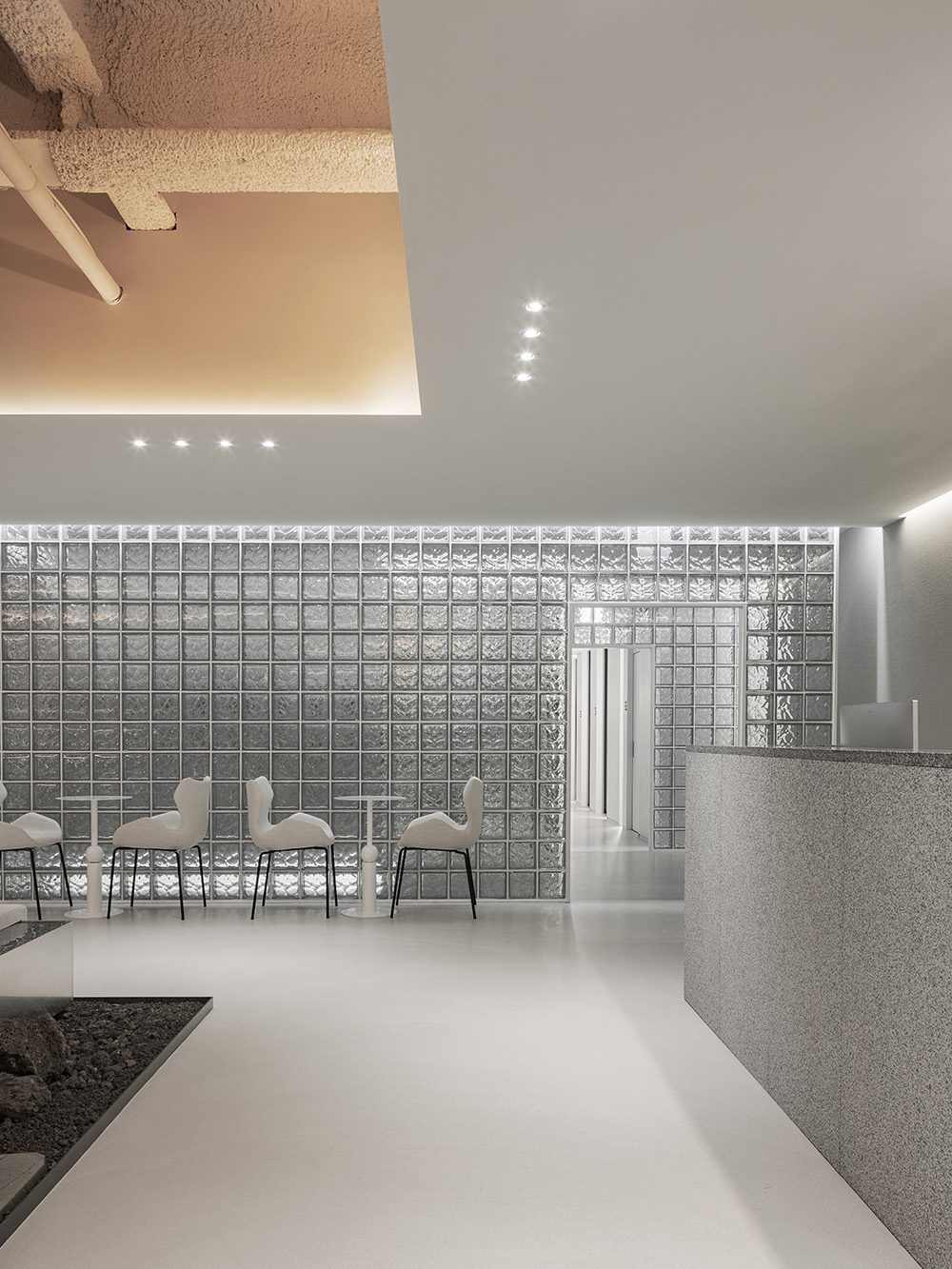 물성이 강조된 돌, 스틸, 모래로 만든 유리블럭 그리고 돌멩이와 그사이 틈에서 자라나는 자연재가 조화됨으로 그렇게 방법을 취했다.