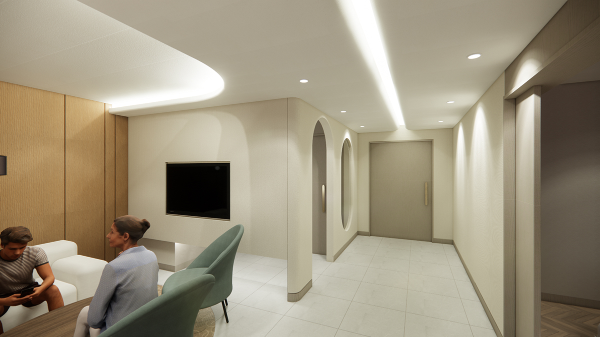 복도 휴게공간 가구를 포함한 디자인 전체의 조화성을 고려, 전체적으로 따듯하고 부드러운 톤의 마감재와 색온도를 활용해 공간의 부드러움과 잘 융화되어 사용자에게 편안함과 안정감을 주는 공간을 제안한다.