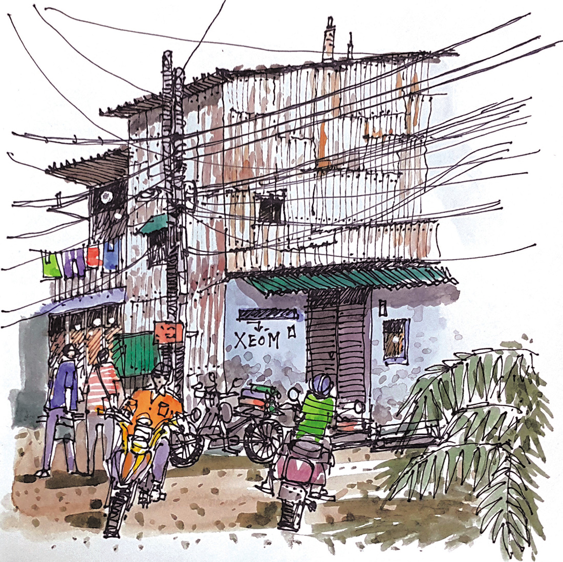 여기저기 물이 고여 지저분하게 보이는 보행로남루한 가게 앞에서 웃통을 벗고 휴식 중인 고단해 보이는 주민들.