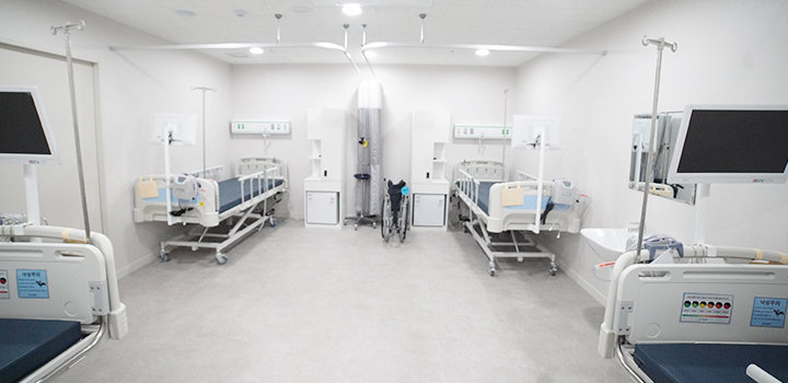 우리 병원 같은 경우는 환자의 움직임이 원활하도록 재활적인 측면에서 공간적인 할애를 많이 한 편입니다. 정부는 최근 병원허가 기준 병상을 4인실로 변경했으며, 침대와 침대의 간격을 1.5m 정도 띄울 수 있도록 권고했습니다. 기존에는 이런 규제가 없었기 때문에 조그마한 공간에 많은 침대를 놓아도 문제 되지 않아 환자들이 좁은 공간에서 여유롭지 못한 생활을 했었습니다. 하지만 우리병원의 경우 침대와 침대 간격을 2m 이상 띄웠습니다. 왜냐하면 정형외과 병원은 다른 병원과 다르게 휠체어들이 드나들어야 합니다. 그만큼 동선 자체가 환자들의 움직임에 따라 치료에 대한 케어가 크기 때문에 공간 할애를 많이 했다고 볼 수 있습니다. 우리 병원이 굉장히 넓은데도 72병상밖에 나오지 않은 것은 환자들이 좀 더 쾌적한 환경에서 재활을 받도록 하기 위한 것입니다. 그러다 보면 좀 더 프라이빗한 공간들도 많아지기 때문에 환자 입장에서 공간적인 편안함을 추구할 수 있을 것으로 생각됩니다.