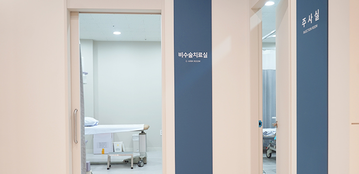 건물 내부는 이를 반영이라도 한 듯 개방감 있는 병실과 쾌적한 환경, 아이보리 컬러의 밝고 화사한 색채감, 키 컬러인 블루의 포인트적 요소가 스며들어 기능적인 우아함마저 느껴진다. 더구나 병원에서 군더더기 없이 깔끔하게 연출된 동선의 라인과 공간적 여유, 구획을 나누는 곡선의 디테일 등은 실용성까지 겸비된 모던한 미적 감각을 드러내고 있다. 천정의 매입등은 간격을 두고 적용되어 빛의 시선을 다각도로 분산시키는 효과를 자아냈다. 하지만 이러한 빛의 퍼트림이 단차감을 준 블루 컬러 라인에 거쳐 가도록 디자인되어 무한정한 빛 번짐의 움직임을 안정화시켰다. 그만큼 모던함에 절제미까지 더해진 공간은 기존 병원에서 느낄 수 있었던 긴장감을 완화시켜 훨씬 편안하게 다가왔다.