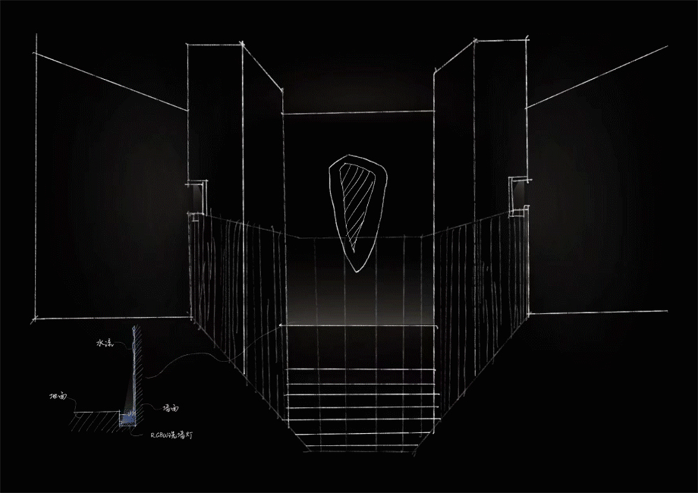 천상의 거울(An Ethereal Mirror)이 위치한 계단 옆 폭포 벽은 흐르는 물의 매혹적인 아름다움에서 영감을 얻은 컨셉으로, 빛과 그림자의 상호 작용은 공간에 활력을 불어넣고, 조명을 통해 설치물에 신비감을 더했다. 해당 부분은 일출의 빛을 닮은 변조된 주황색 조명으로 비춰지는데, 내부공간에 전체적으로 사용된 회색과 대비되는 밝은 색상의 주황색이 고객으로 하여금 잠시 멈추고 머물게 만들며, 흐르는 물의 백색소음은 고객에게 조화롭고 고요한 분위기를 조성하여 도시의 번잡함을 잊고 테라피에 몰입할 수 있게 해준다.
