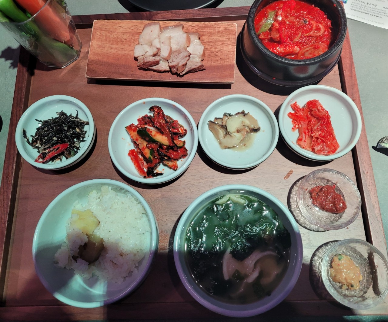 약 한시간 동안 두 명의 배우가 해녀의 고달픈 삶과 애환을 이야기하듯 풀어낸 후 드디어 한상 차림이 제공되었다. 한상에는 고구마밥에 조배기 (메밀가루로 만든 수제비의 제주 방언) 미역국’이 나왔는데, 조배기 미역국은 만삭인 해녀가 물질하다가 갑자기 산통이 오면 배위에서도 출산하는 경우가 있었다는데, 그런 해녀들에게 최고의 산후조리 음식이었다고 했다.
