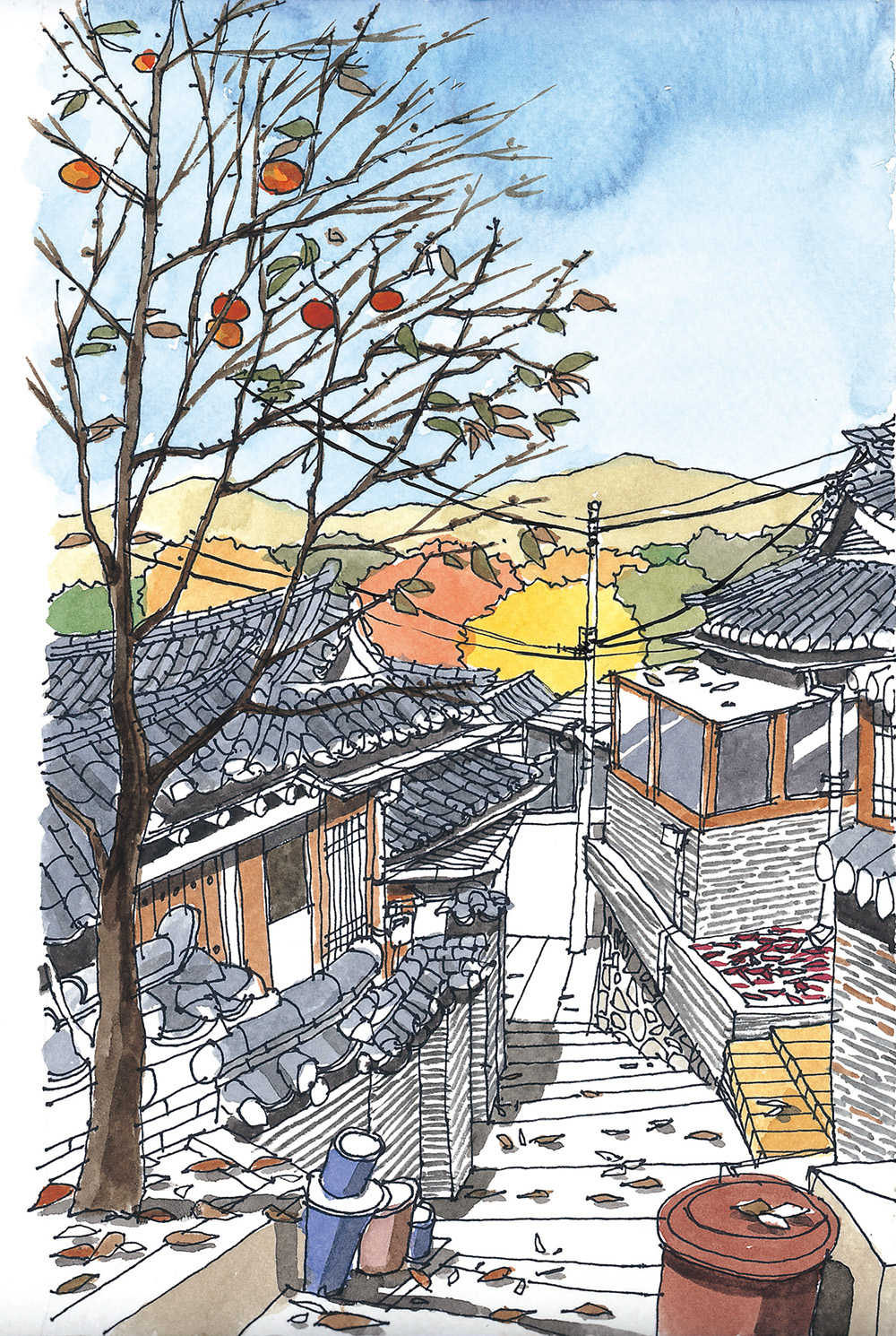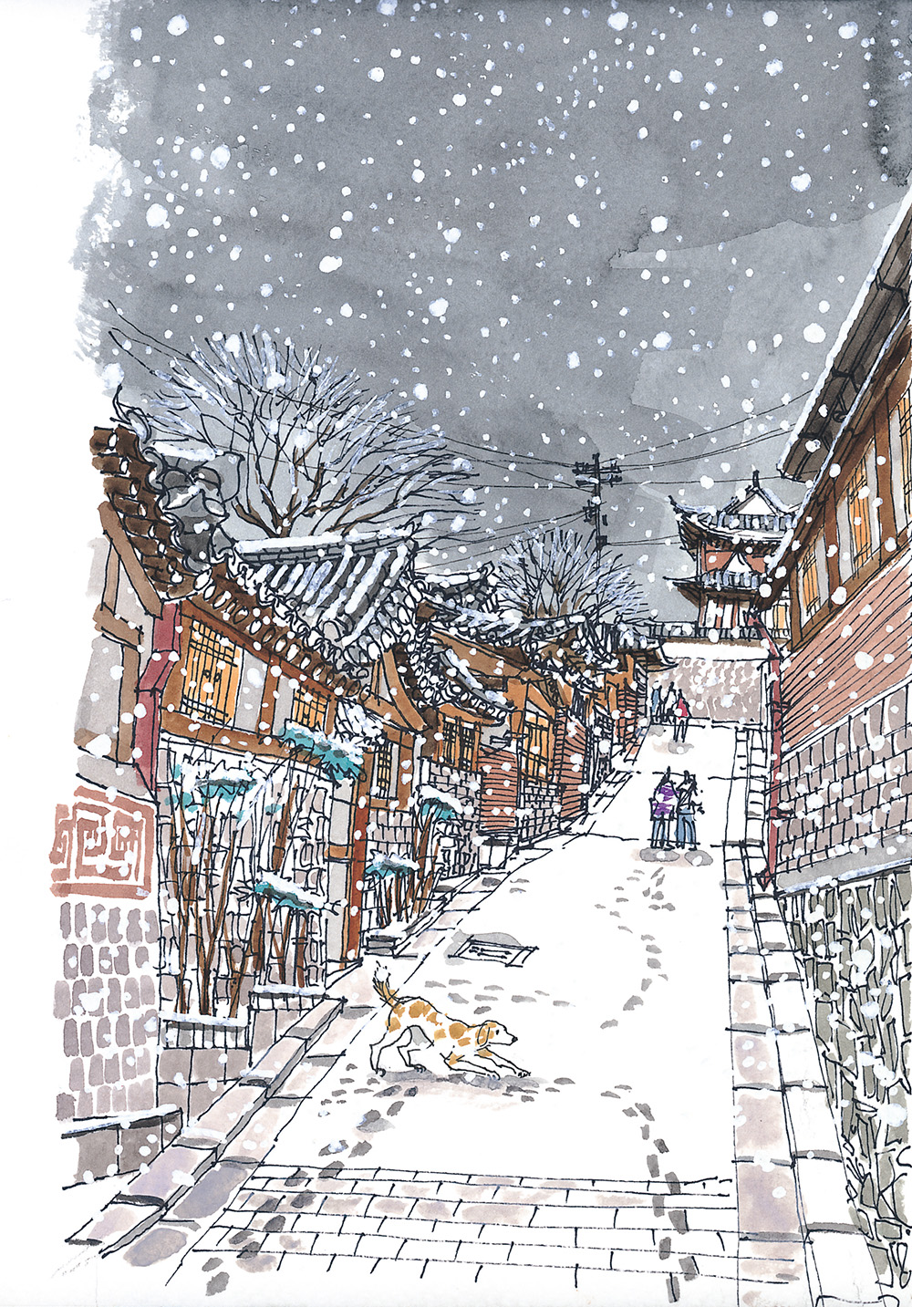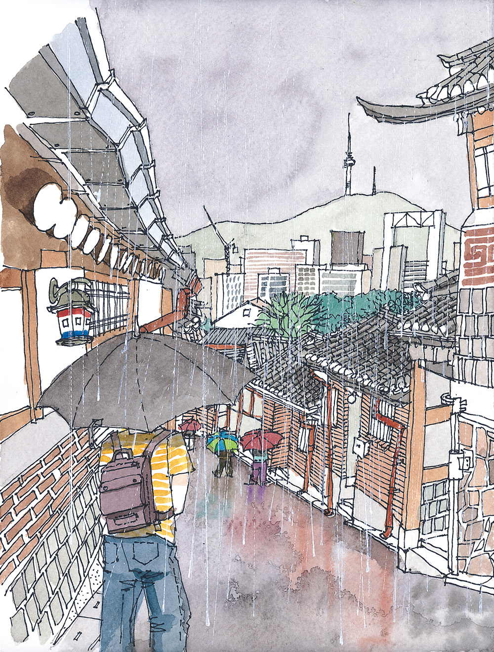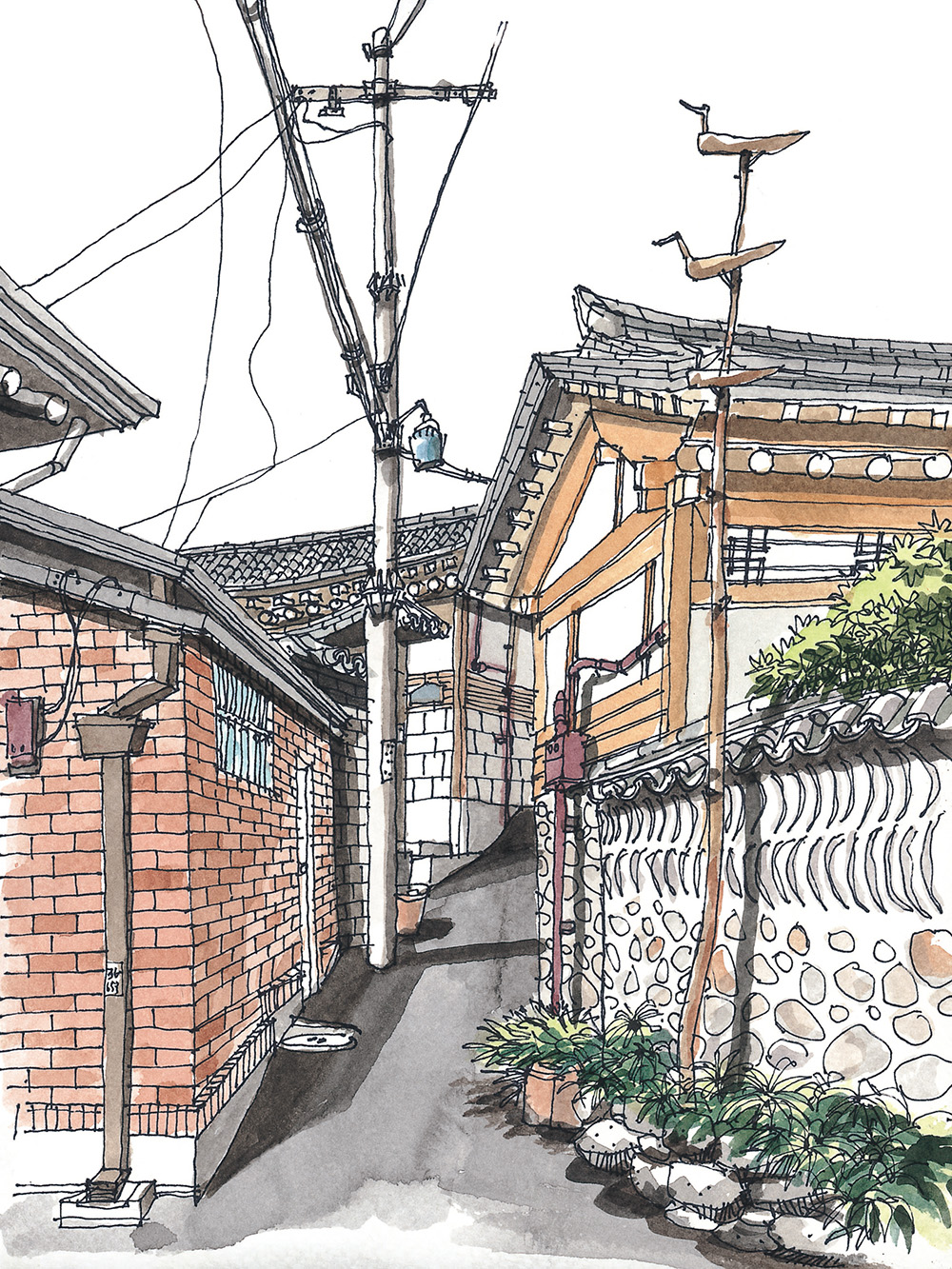 지우헌 앞길 600년 역사를 간직한 대한민국의 수도, 서울의 정체성은 한양도성을 비롯하여 오래된 궁궐건축과 면면히 이어져 온 전통한옥들이 잘 나타내준다. 특히 북촌과 서촌에 남아있는 가옥들은 주민들의 삶과 일상으로 이어지며 오랜 역사를 지닌 서울의 자랑거리 중에 하나다. 몇 년 전, 서울시에서 북촌 한옥마을을 주제로 홍보용 탁상 캘린더를 제작했는데 그때 우연히 기회가 되어 북촌풍경 그림을 그려서 재능기부하게 되었다. 그 이후부터 서울에 보존되고 존치된 전통가옥들에 대해 조금 더 관심을 갖게 되었다. 그리고 주말에 시간이 날 때마다 경사진 골목길을 답사하면서 한옥들을 그림으로 기록하는 일은 나의 중요한 일상이 되었다. 한국의 전통 건축양식으로 지은 집을 통칭하여 '한옥'이라고 한다. 이러한 한옥들과 골목길 풍경을 몇 장 소개하며 독자들께 답사를 권유하고 싶다. 서울 시민들은 잘 알고 있는 친근한 장소들이지만 스케치를 통해서 본 한옥 풍경들은 조금 더 서정적이고 감성적인 느낌을 전달해 준다.